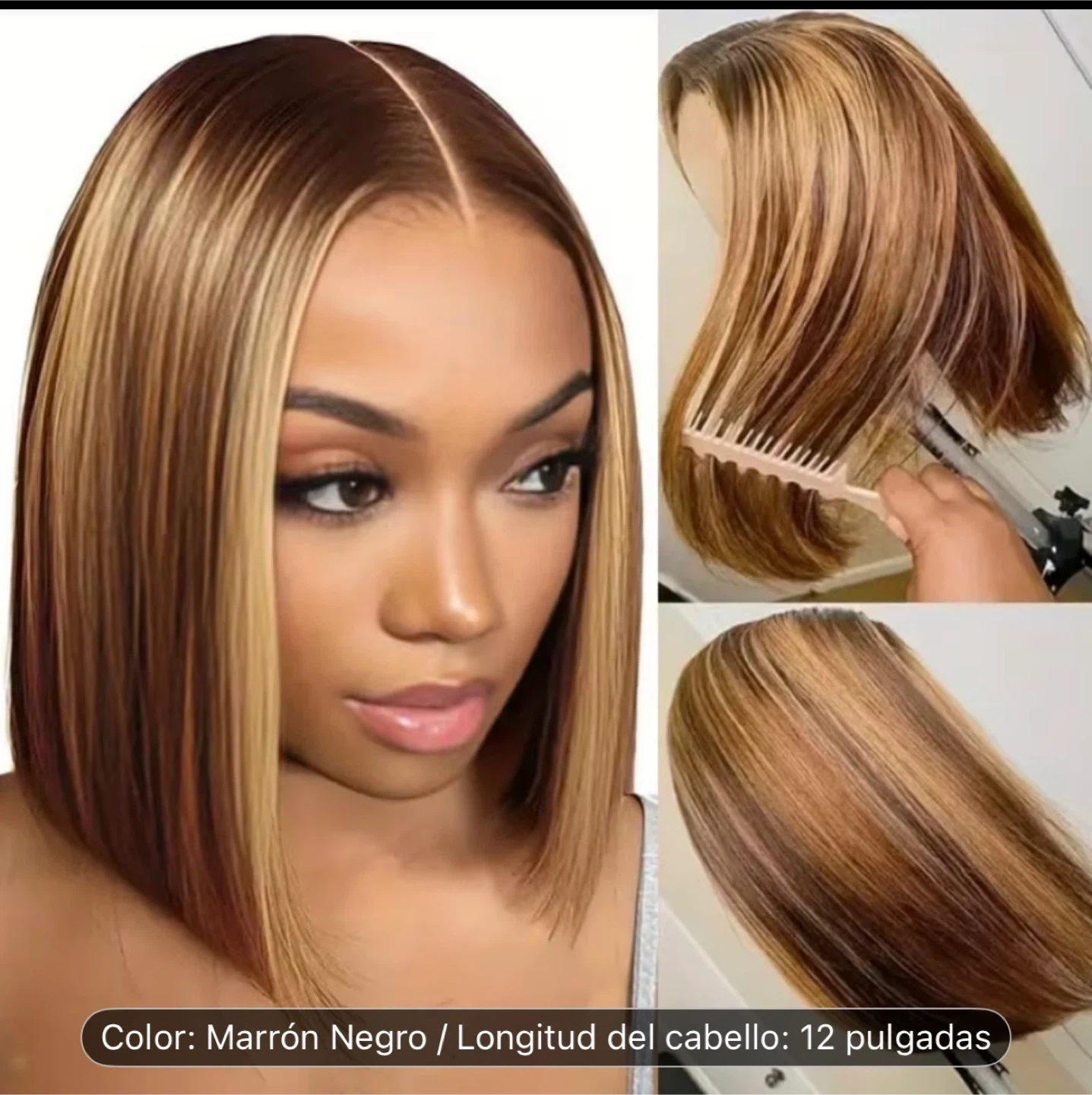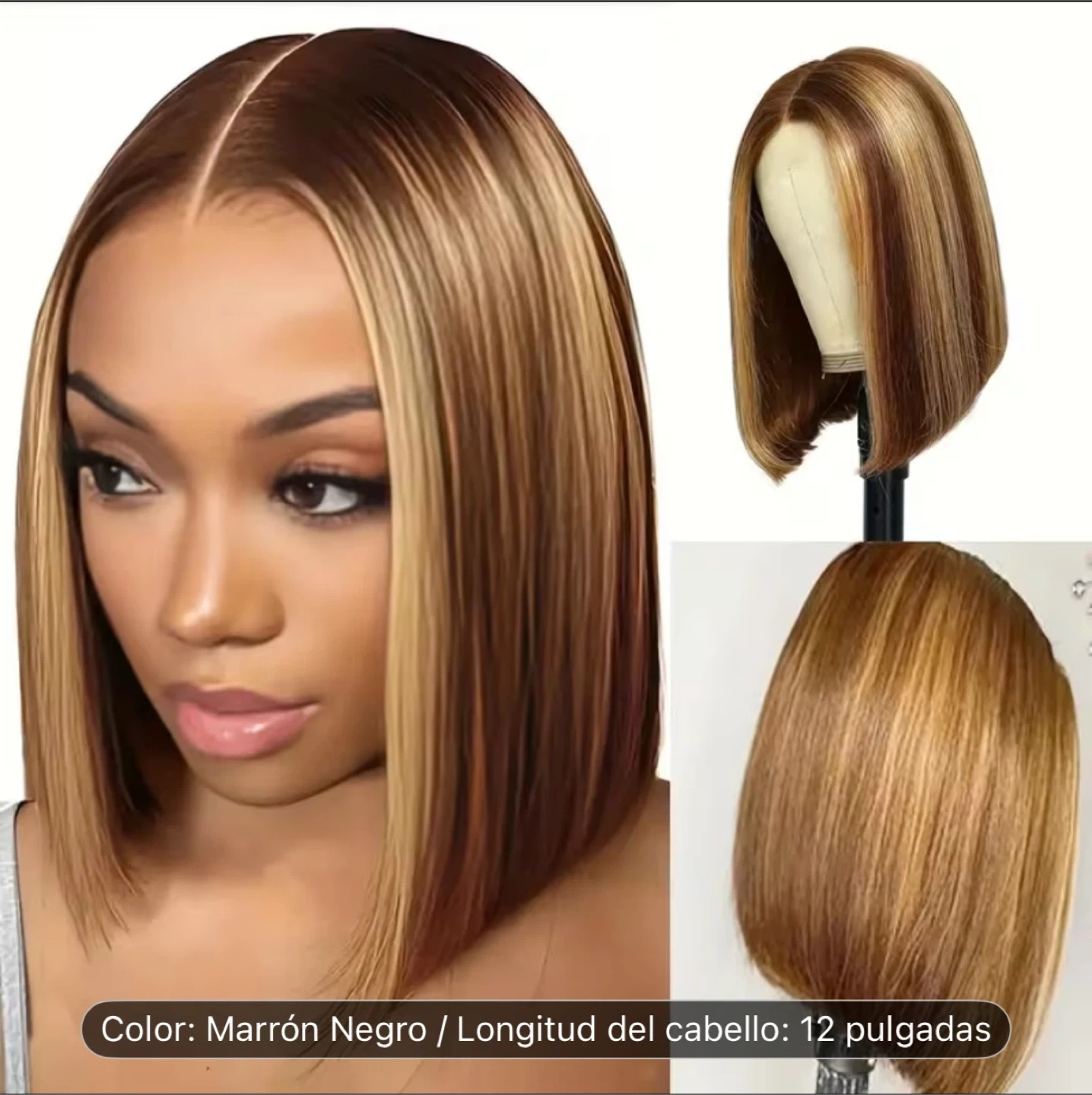 12 Inch Bob Wig - Brown/Black with Blonde Highlights