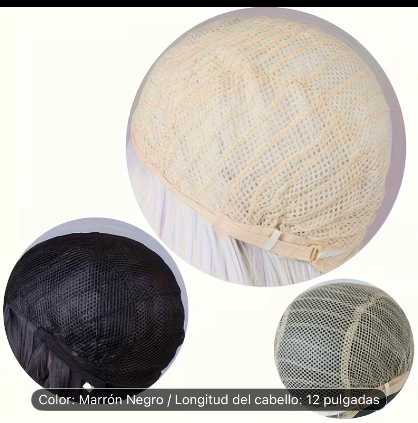 This is a 12-inch bob wig featuring a brown and black base with blonde highlights. The cap construction is shown in the images, with adjustable straps for a secure fit. It's designed for a natural look and easy styling!