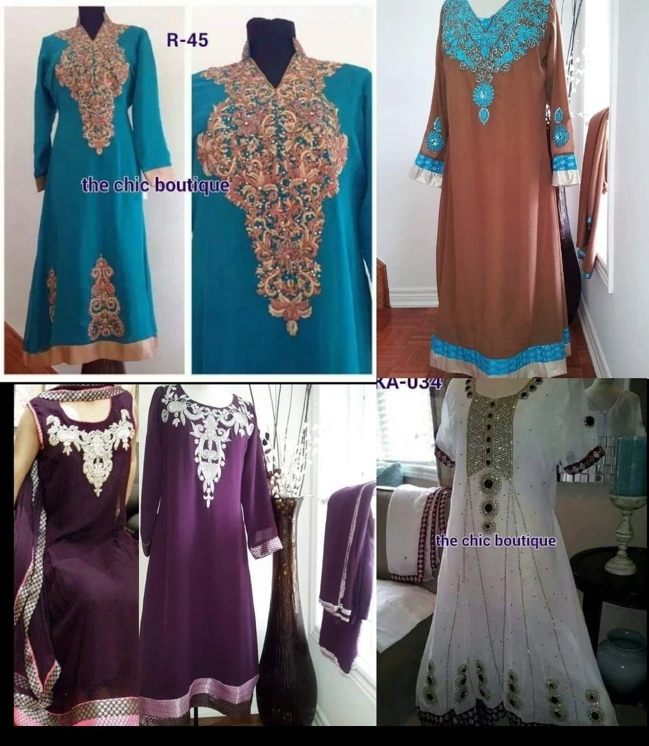 Set of 3 pieces kameez pants and dupatta Several styles and colours are shown, including teal, brown, purple, & white. Ornate embroidery with beads, sequins is featured on the necklines and cuffs. Material chiffon. Available in different sizes $75 each located in Markham Ont