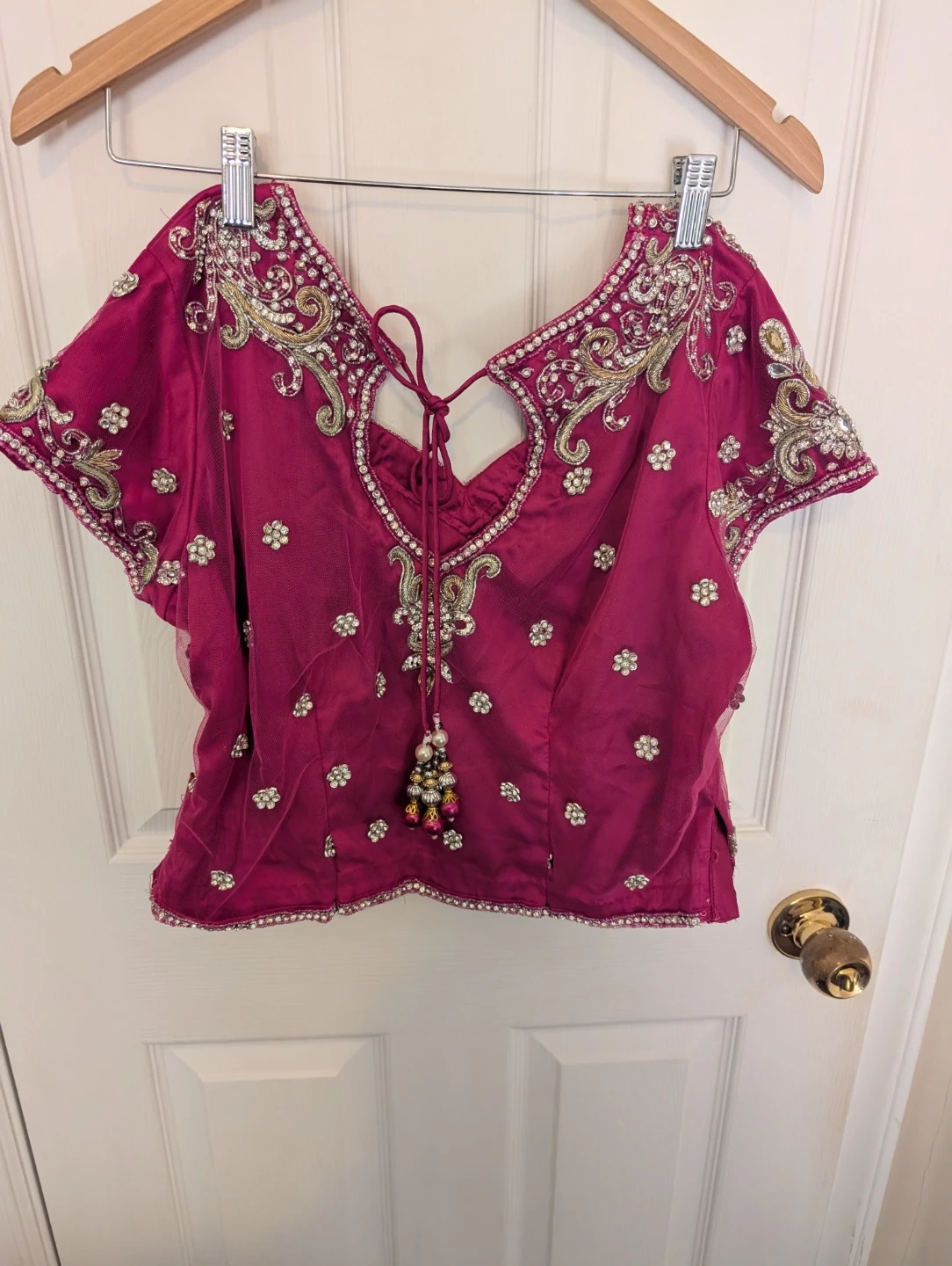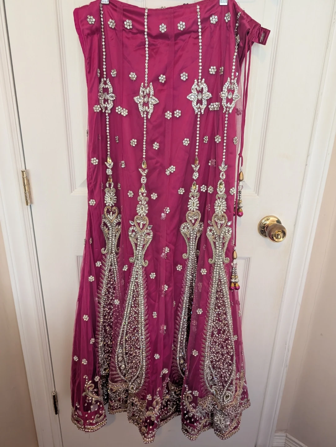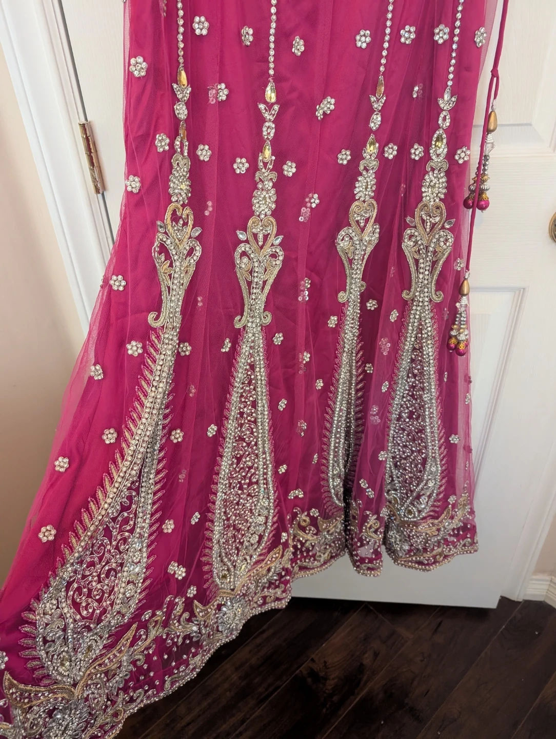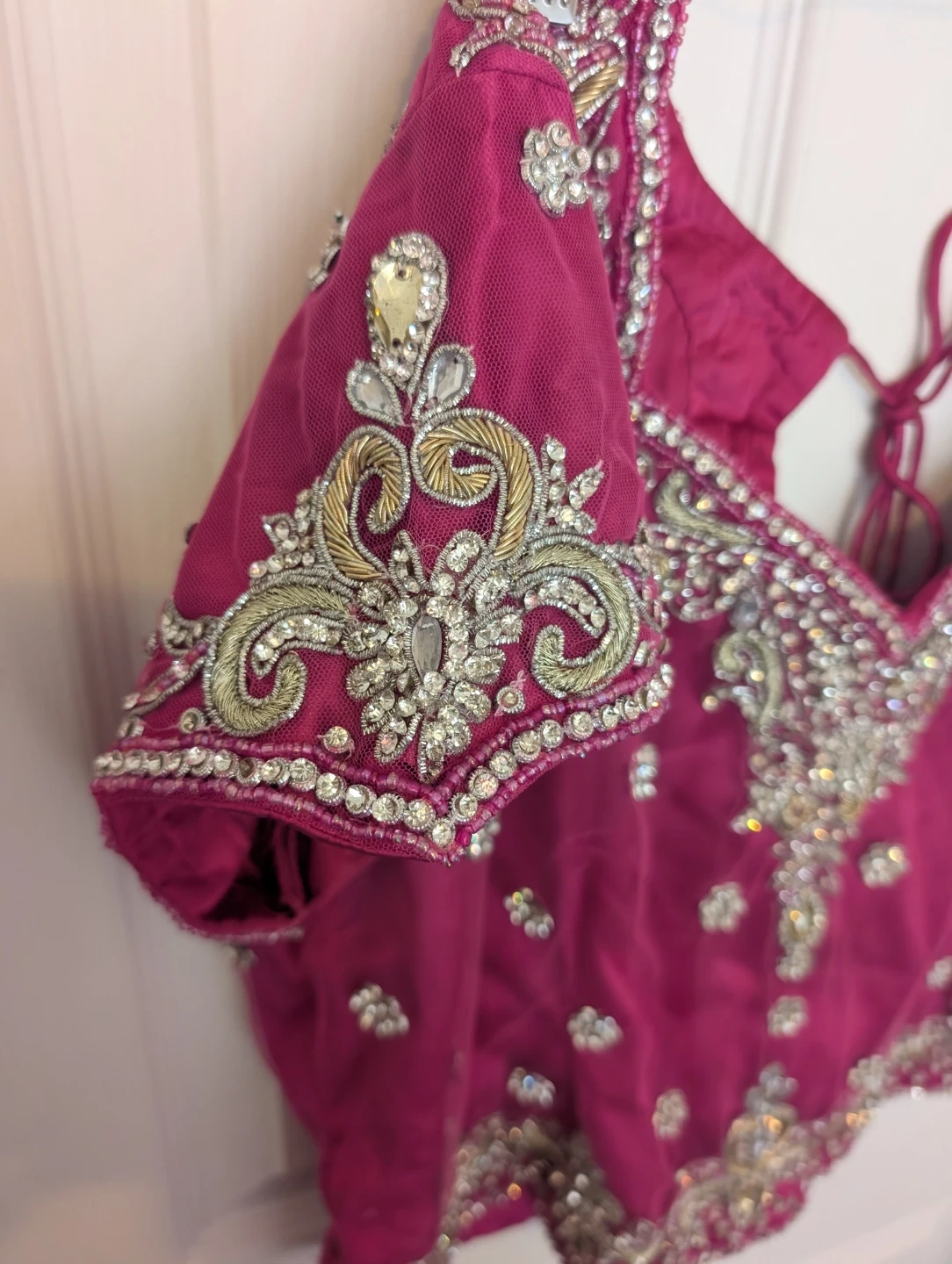 A vibrant pink lehenga choli set adorned with intricate embroidery and beadwork. The set includes a decorative blouse and a flowing mermaid style skirt.