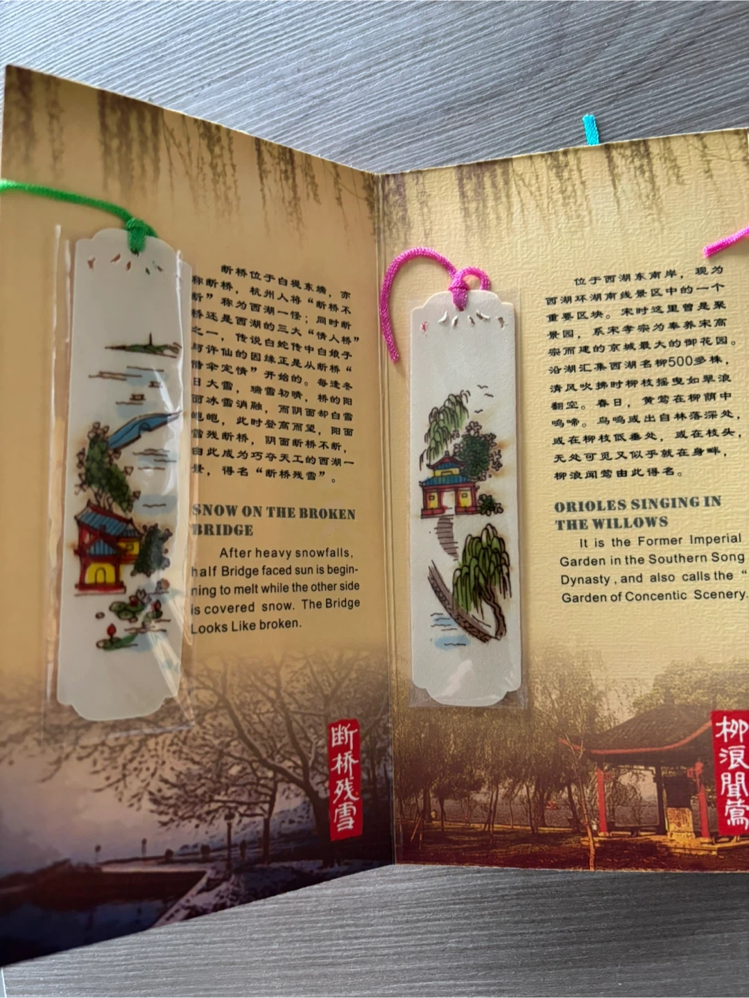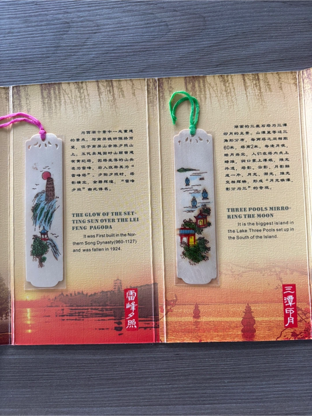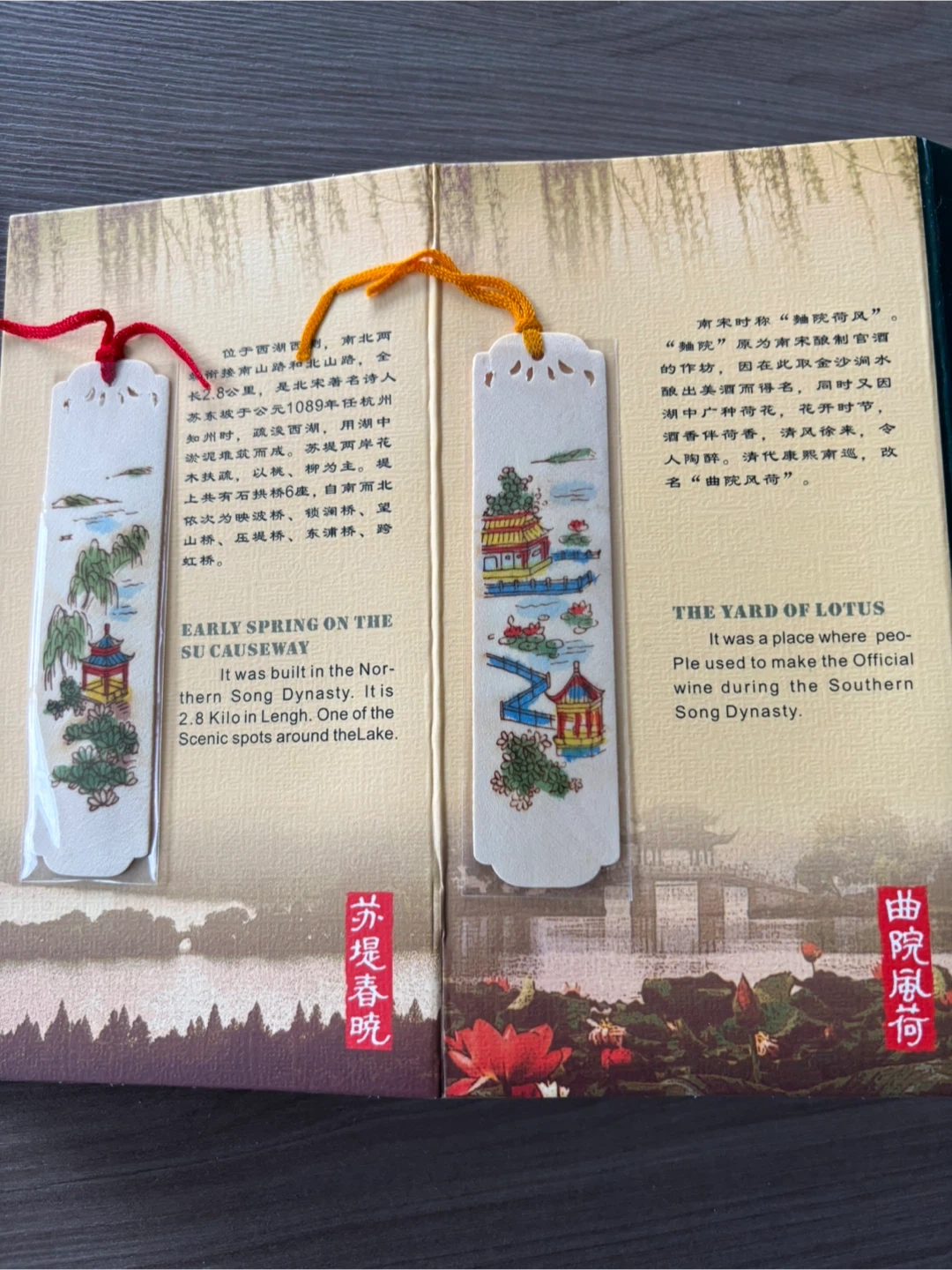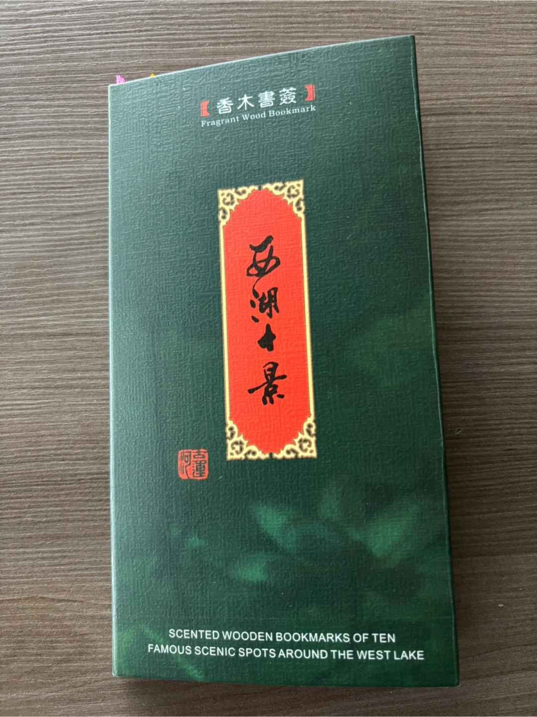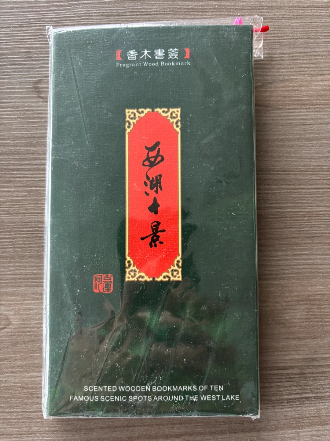 A set of ten scented wooden bookmarks, each depicting a famous scenic spot around the West Lake. These bookmarks are made of fragrant wood. They feature beautiful traditional Chinese artwork and poetry.
