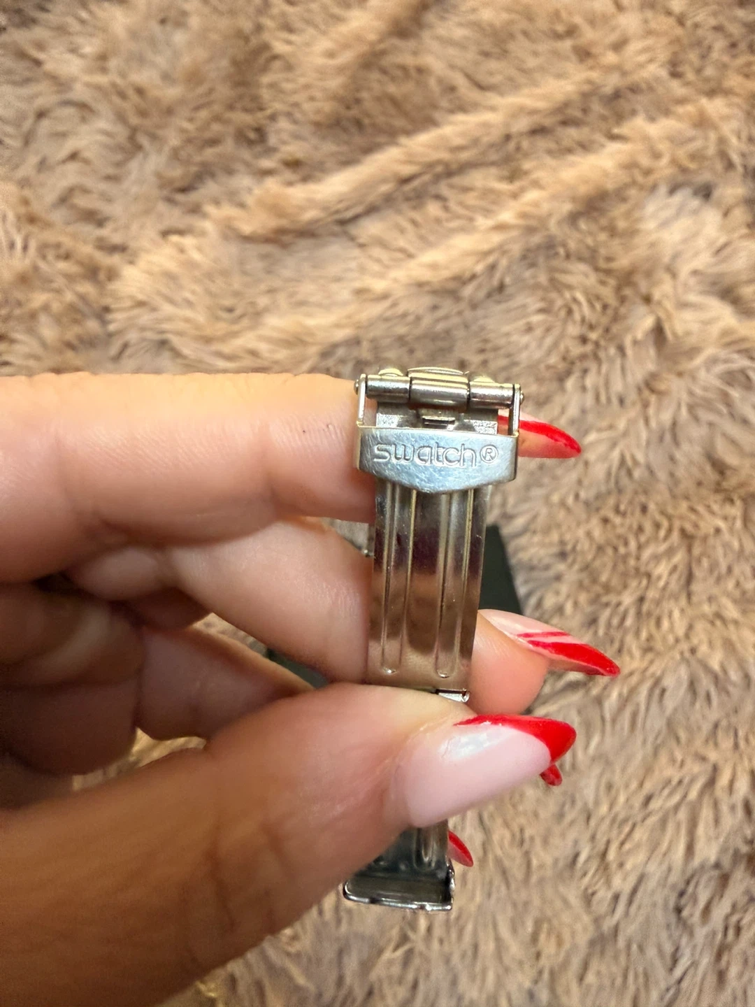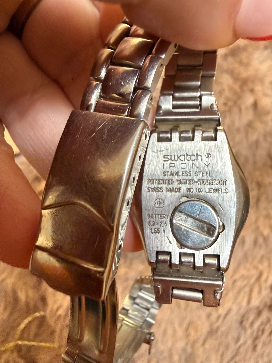 Swatch Irony stainless steel watch with a blue face. Patented water-resistant design.