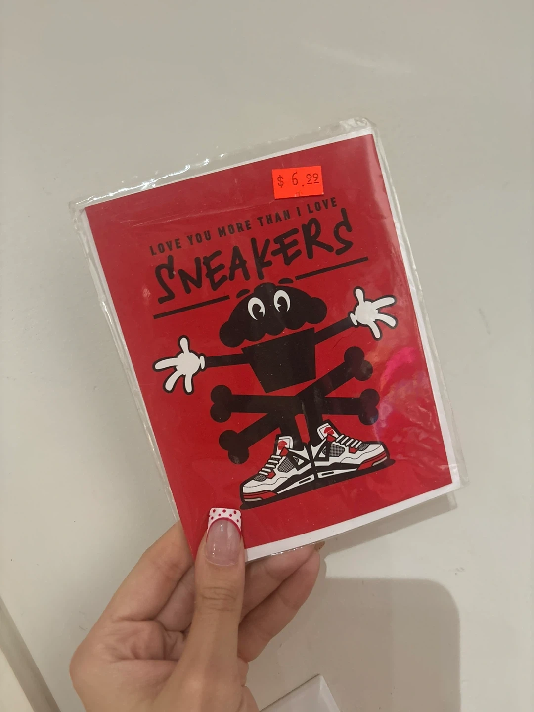 This card says 'Love you more than I love sneakers' and has a fun graphic of a character wearing sneakers. It's a great card for any sneaker enthusiast or for someone who loves you lots! Card includes a graphic of popular sneaker style.