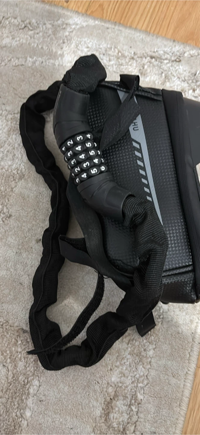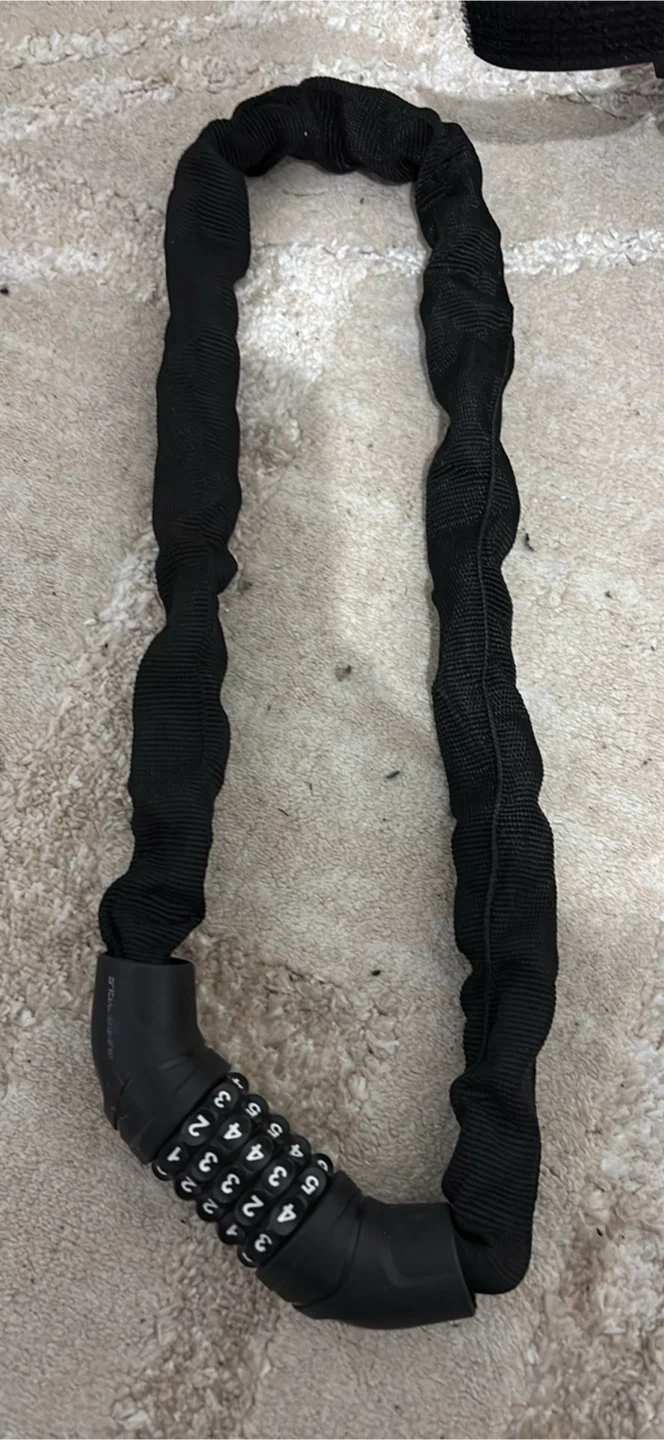 This black chain lock has a 4-digit combination. It also includes a bicycle bag with a clear top compartment. The lock is covered in a protective fabric sleeve.