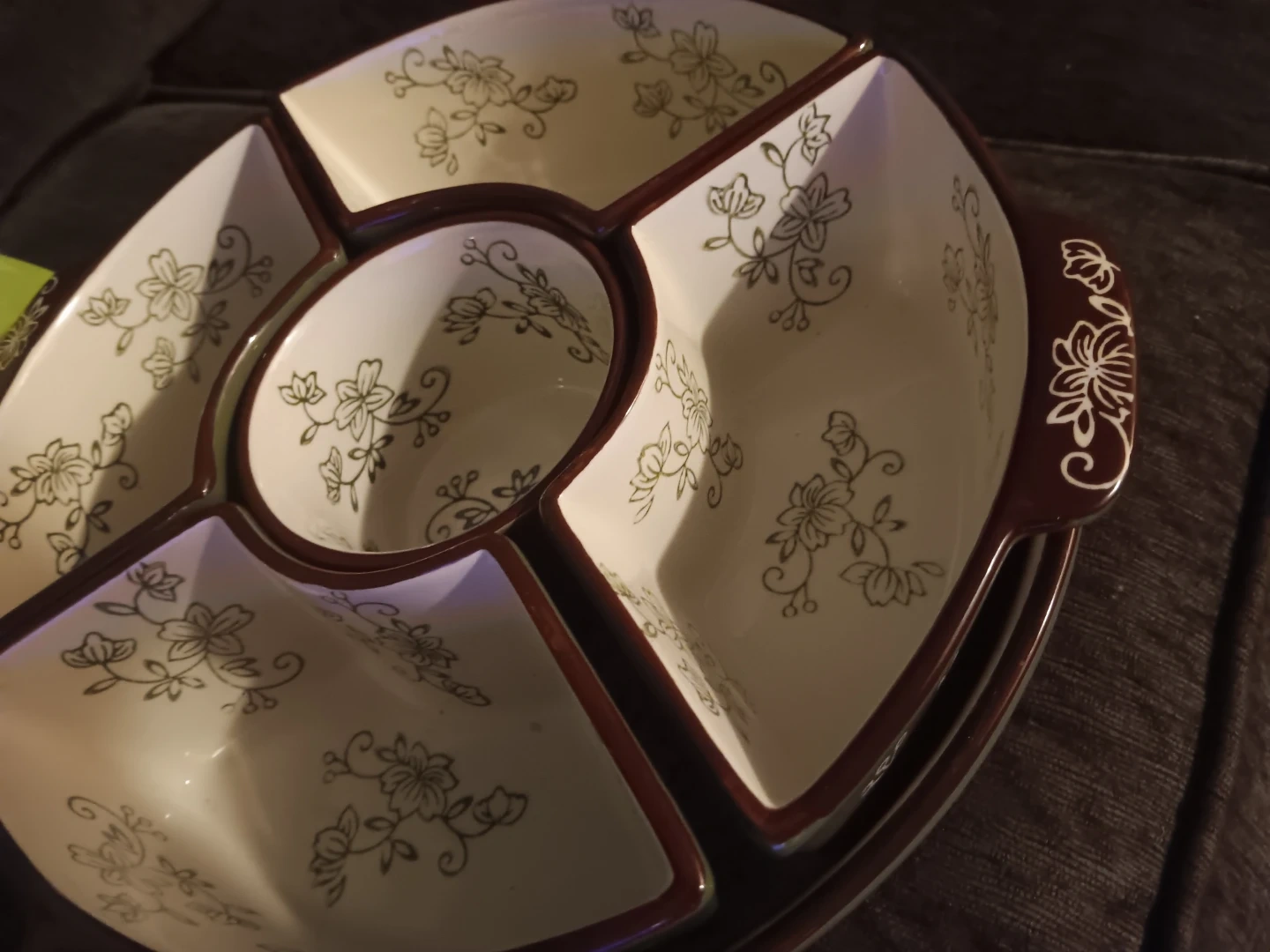 This ceramic serving platter has a green exterior and a cream interior with a floral pattern. It features five sections for serving snacks or appetizers. It's perfect for gatherings and parties!