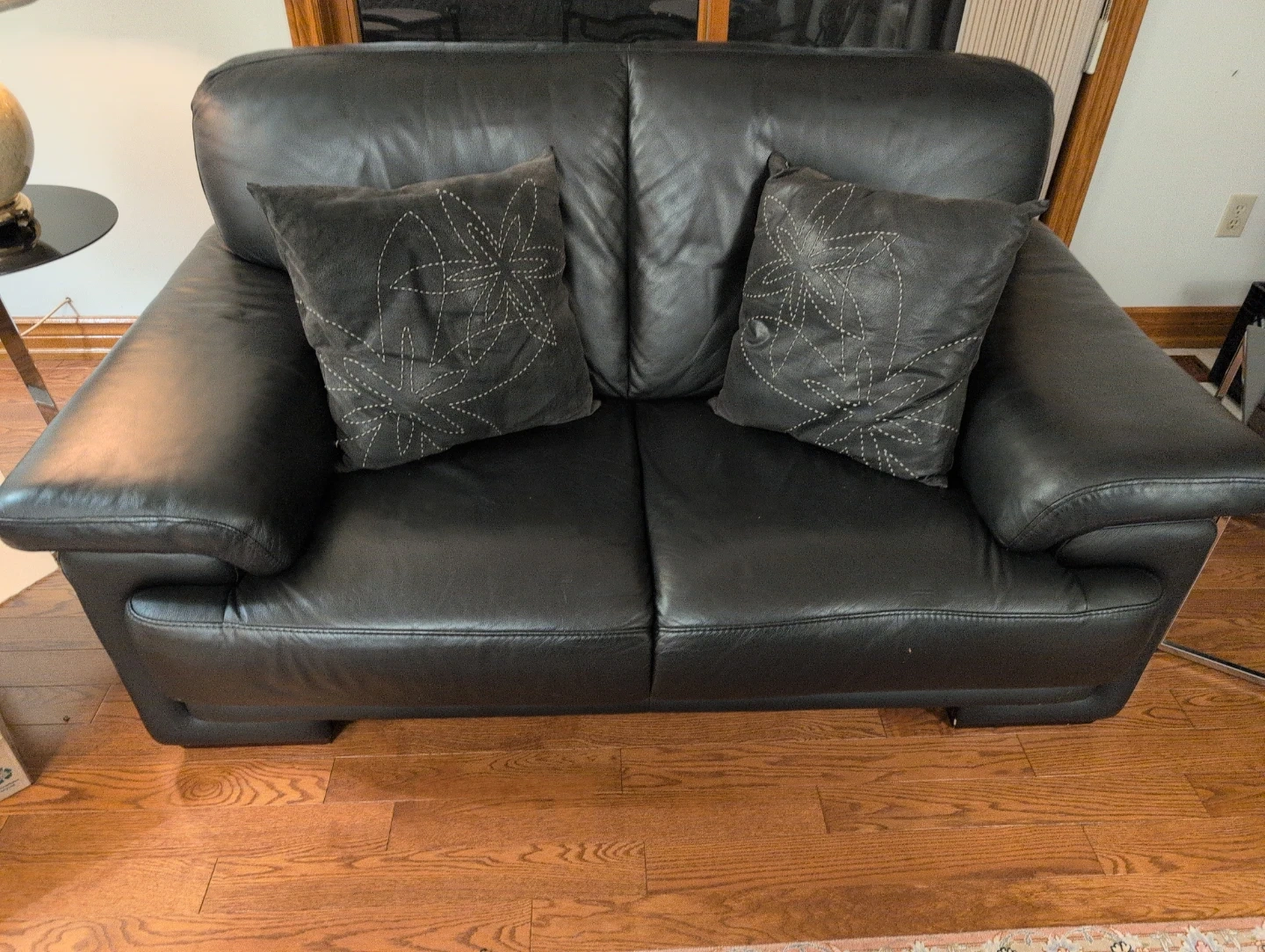 Moving! Black Leather Loveseat Sofa with Decorative Pillows