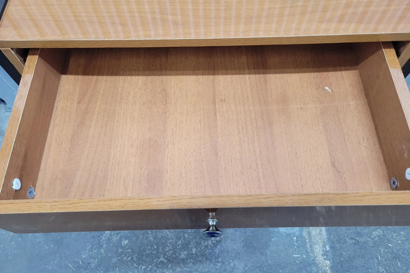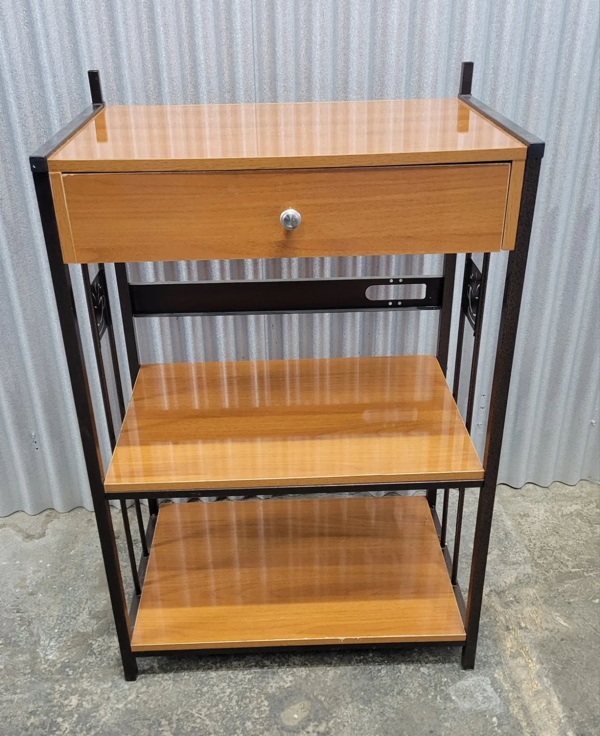 This shelf unit features a wood grain finish with a decorative metal frame. It includes a single drawer for storage and two open shelves below. Its compact size makes it suitable for various spaces.