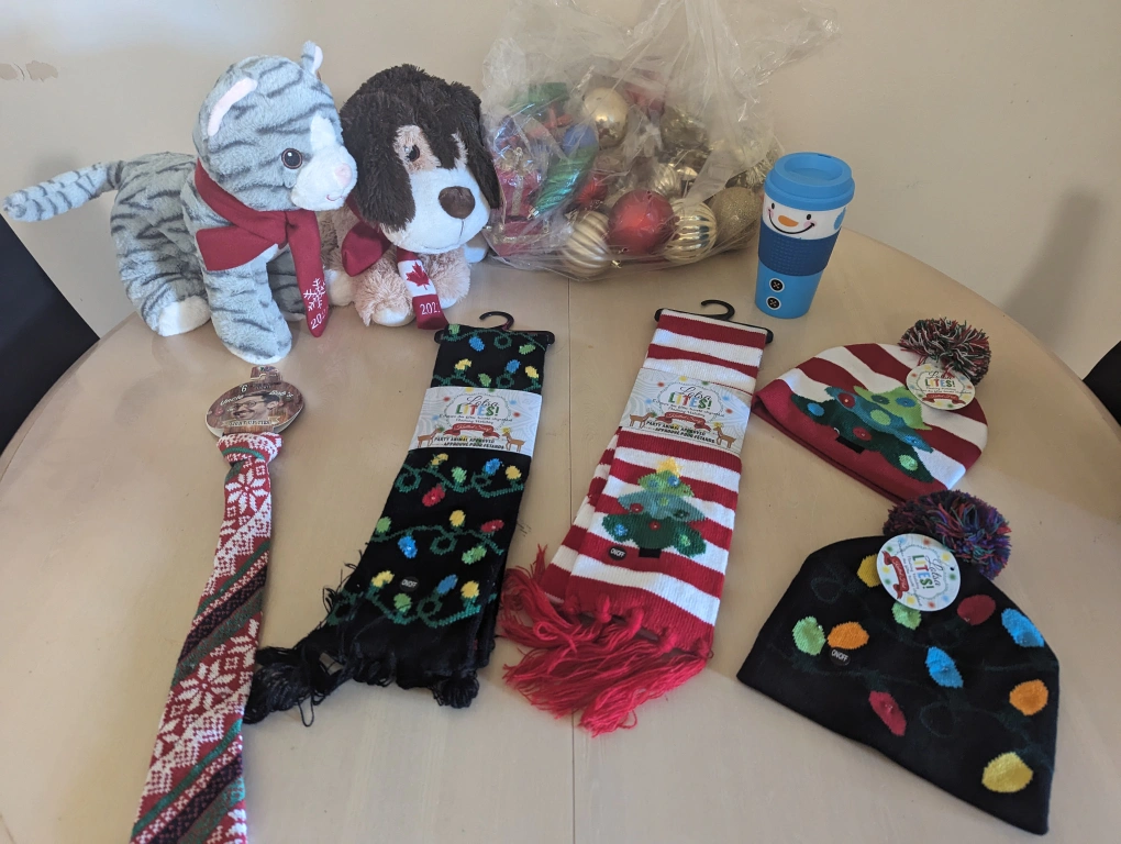 Lots Christmas ornaments, 2 scarves, 2 hats, fun tie. All items are new, Never used. The hats scarf and tie all light up with a press of a botton at the bottom of them.