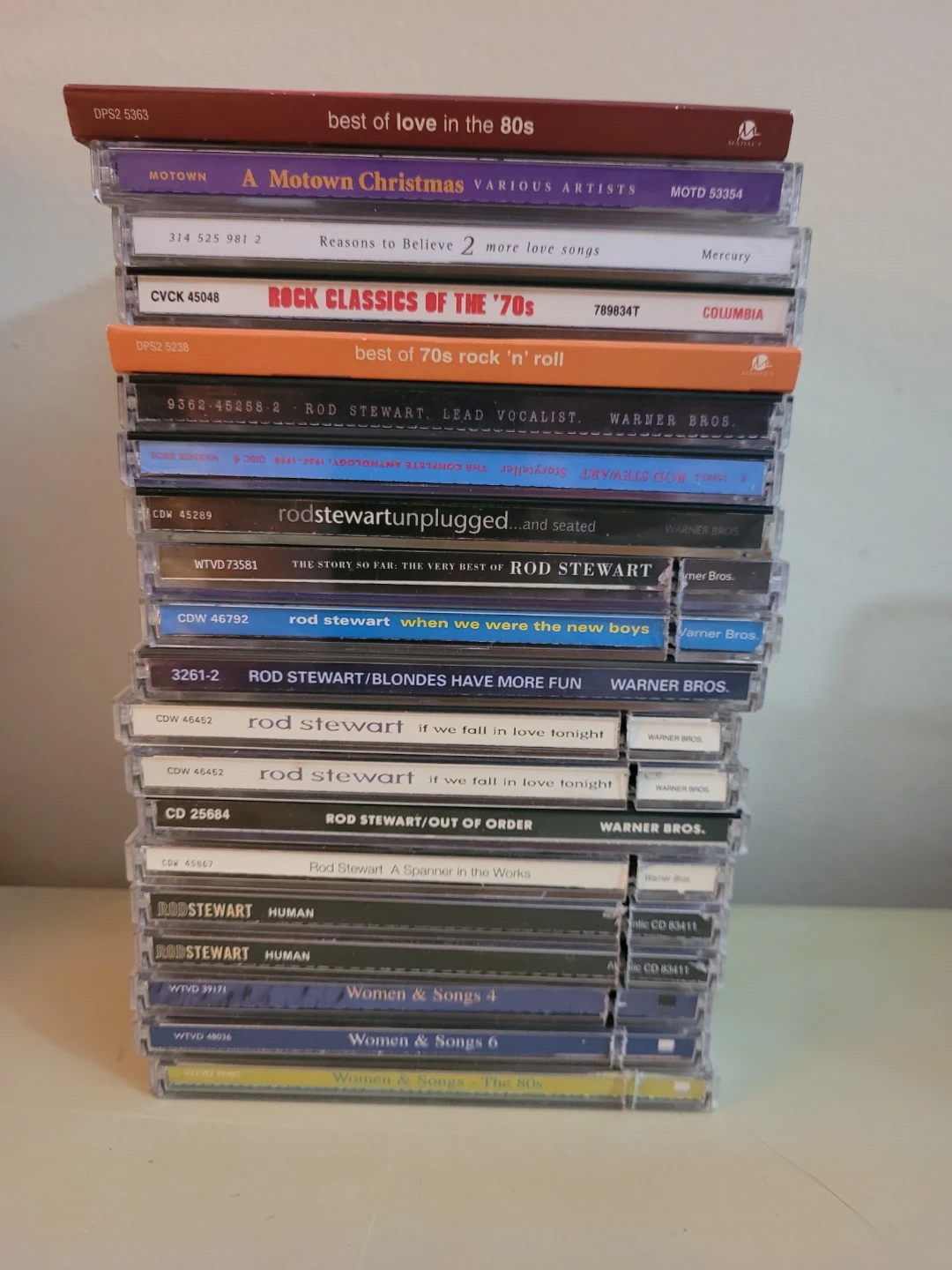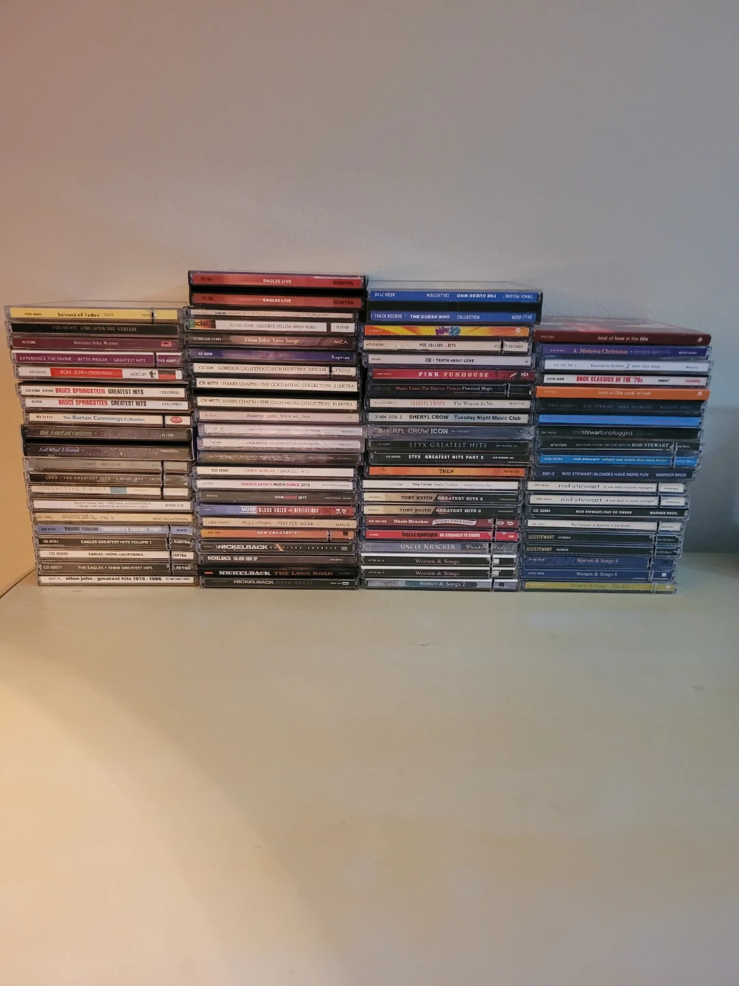 A large collection of music CDs featuring various artists and genres. This lot includes artists like Eagles, Elton John, Rod Stewart, Cher, and many more. Cases and discs are in good condition. Several multi-disc sets are included. Selling as a lot.