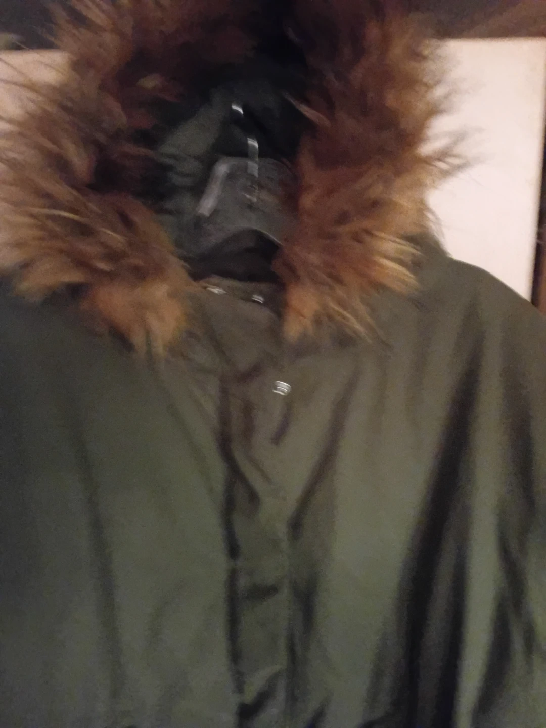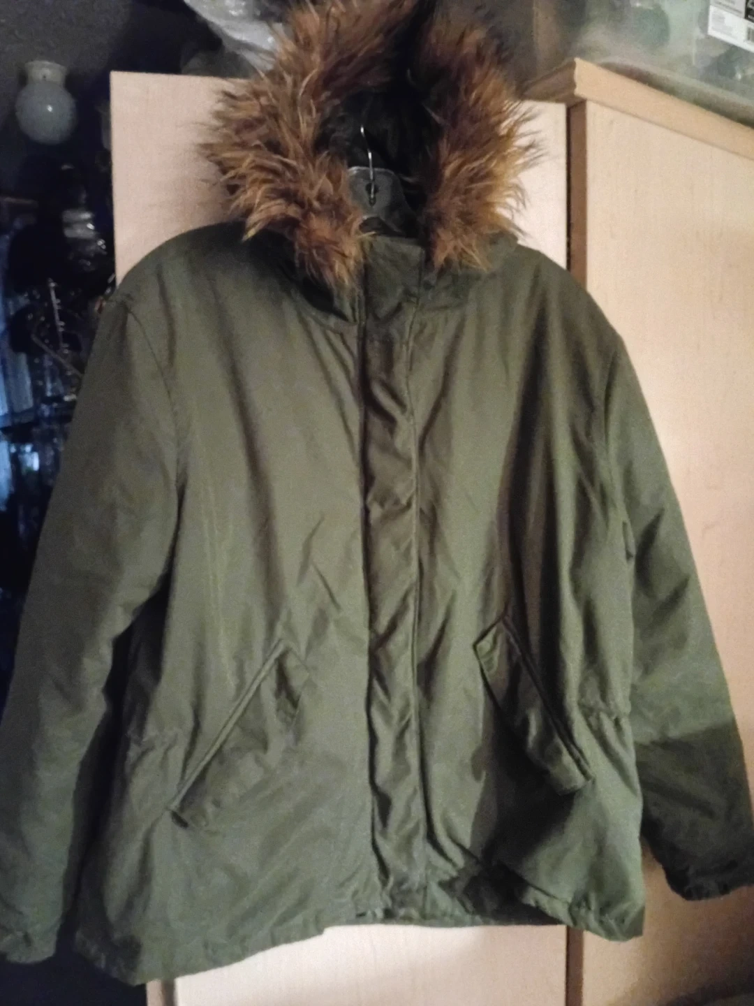 Olive green parka jacket with a cosy faux fur lined hood. It features a full zip closure and adjustable waist tie. This jacket is perfect for staying warm during cooler weather!