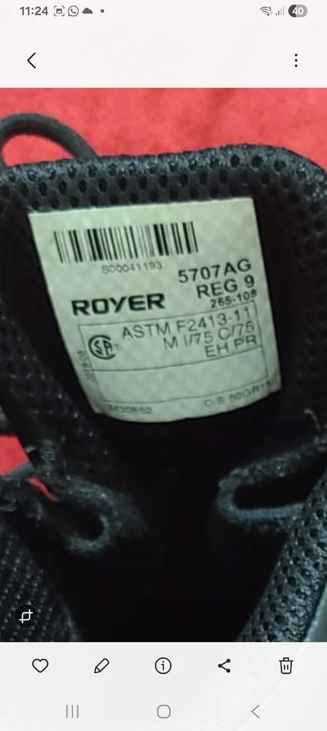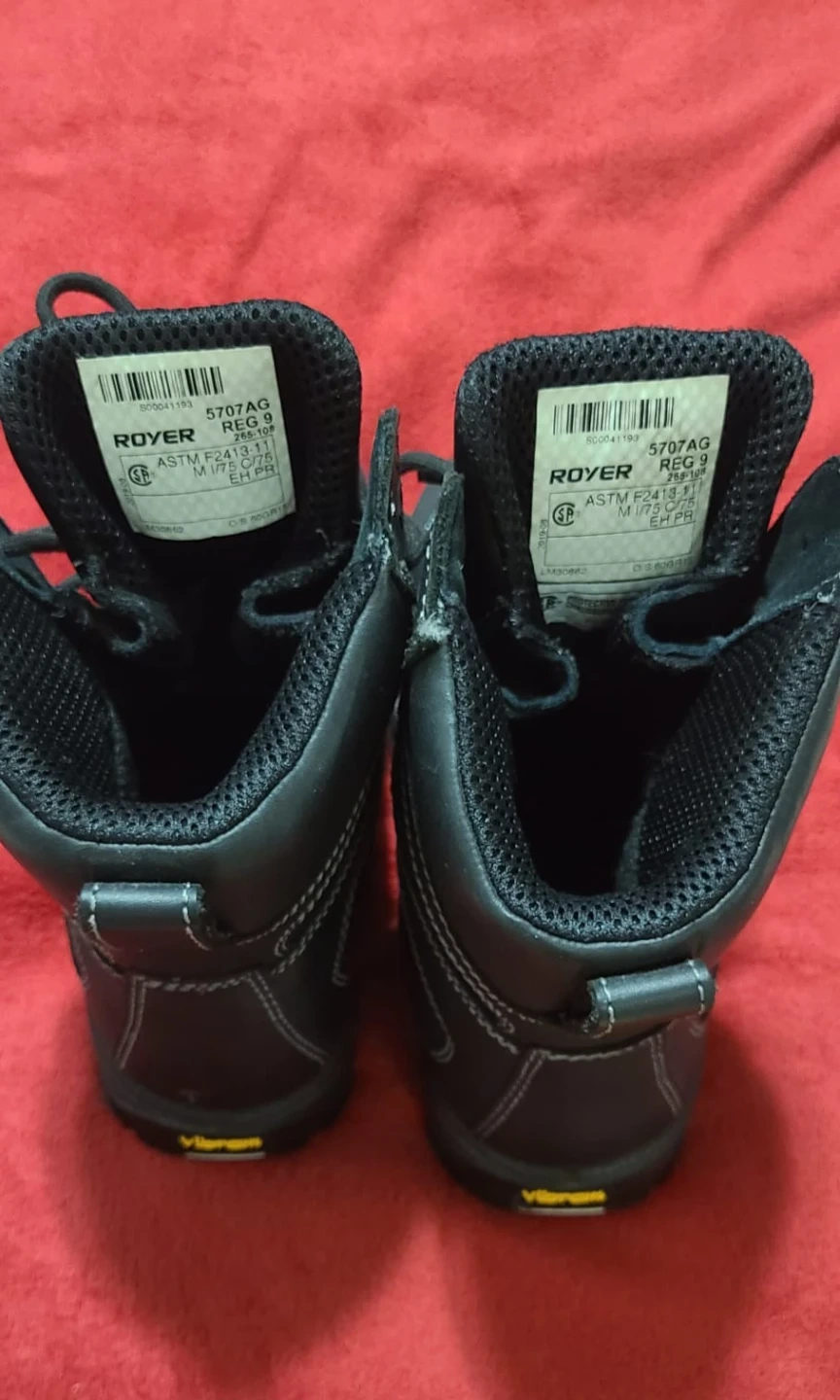 Royer 5707AG steel toe work boots. Reg size 9, M I/75 C/75 EH PR. These boots are made with Vibram Arctic Grip outsoles for enhanced traction. They're designed for safety and durability on the job site.