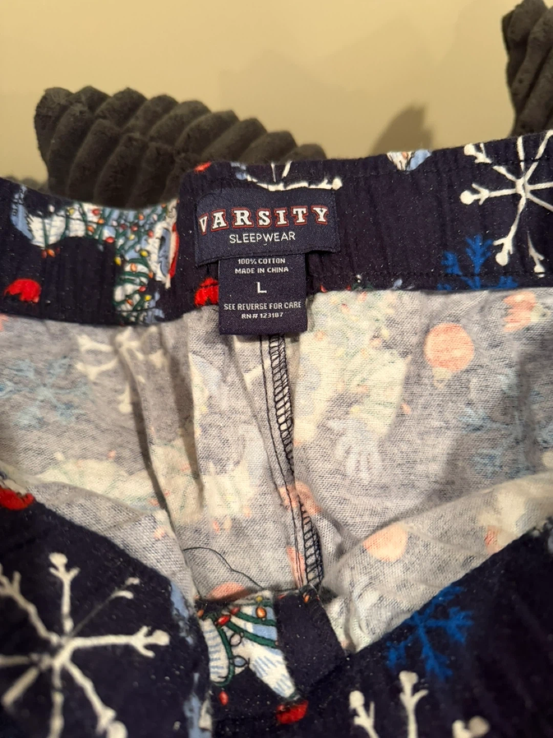 Varsity Sleepwear pajama pants in size L. Made with 100% cotton. Features a festive navy blue pattern with snowmen and snowflakes. My husband needed a different size, these are new, never been worn!