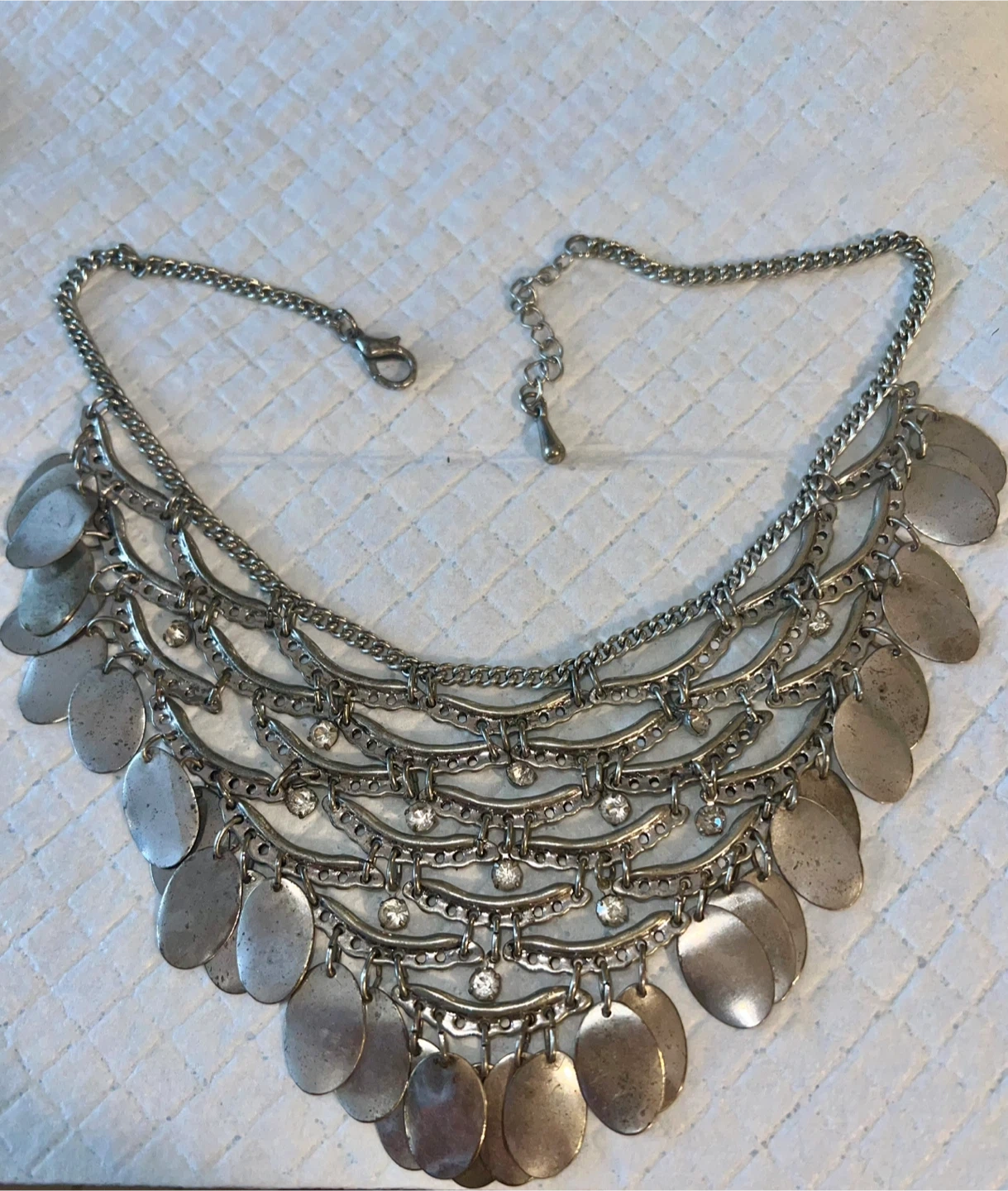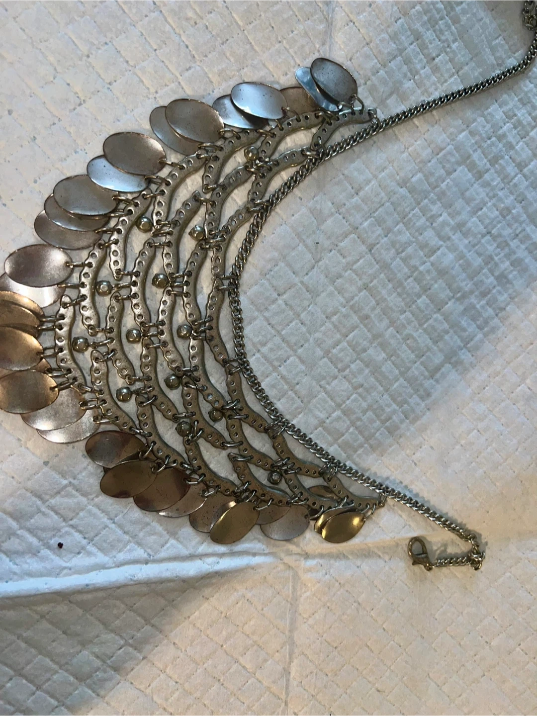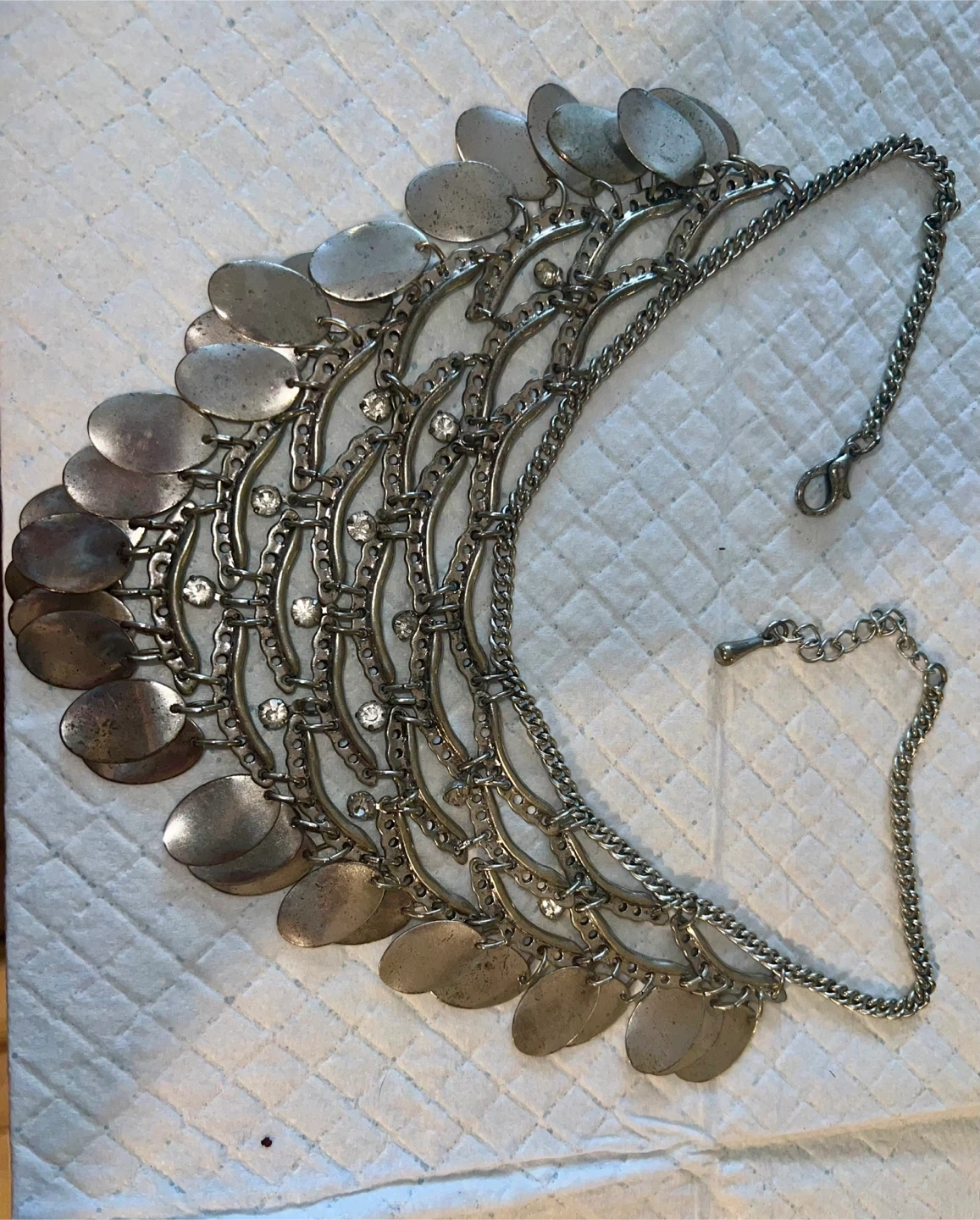 Vintage boho statement necklace with layered metal discs and rhinestone details ✨