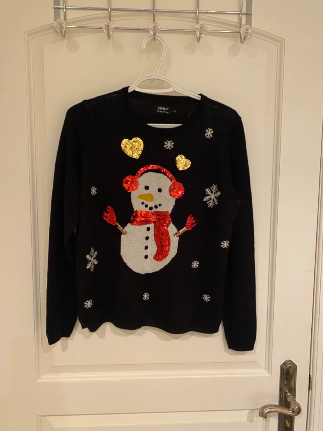 This black sweater features a festive snowman design with sequined accents. It's a fun addition to your holiday wardrobe. Perfect for ugly Christmas sweater parties!