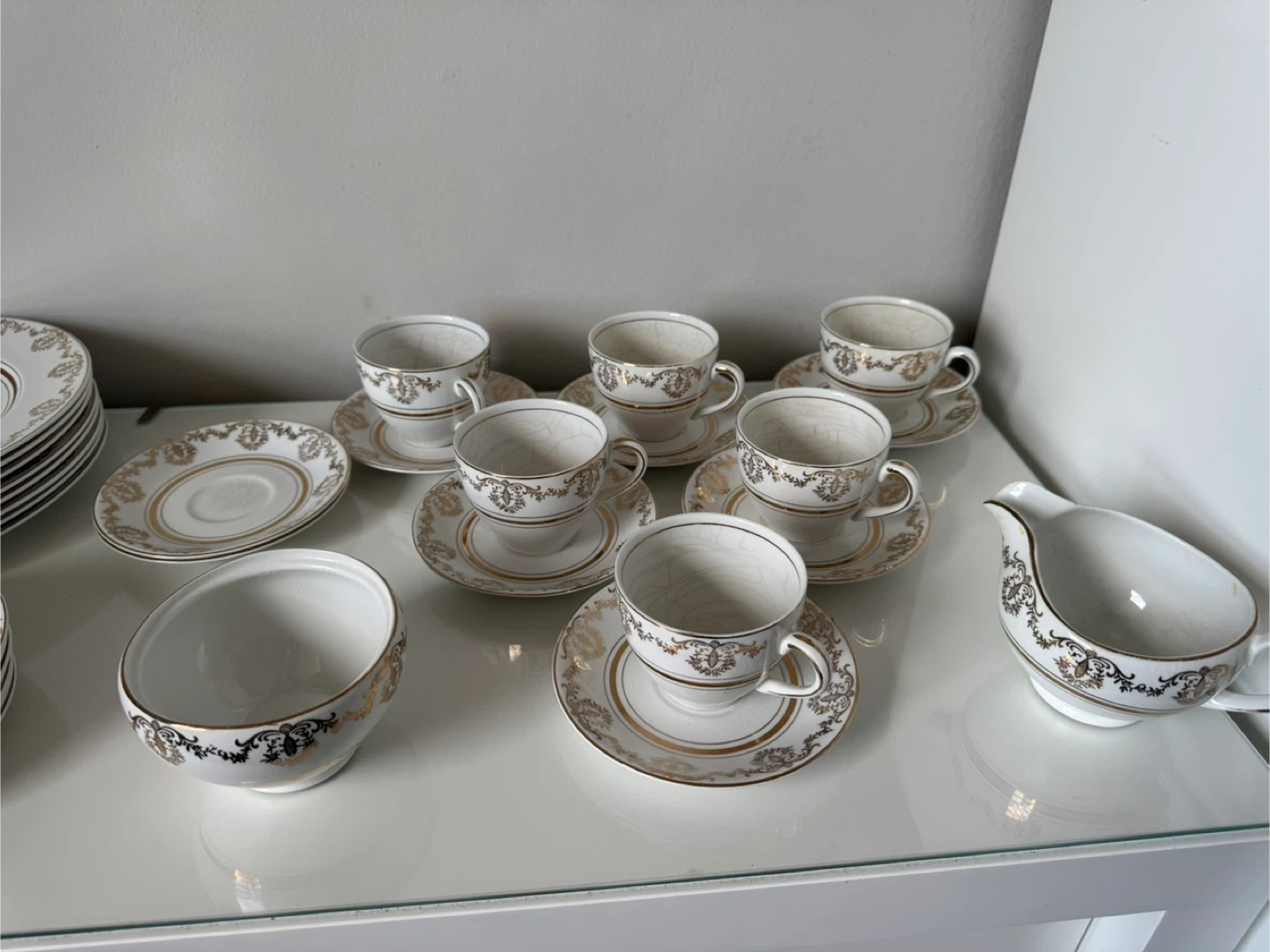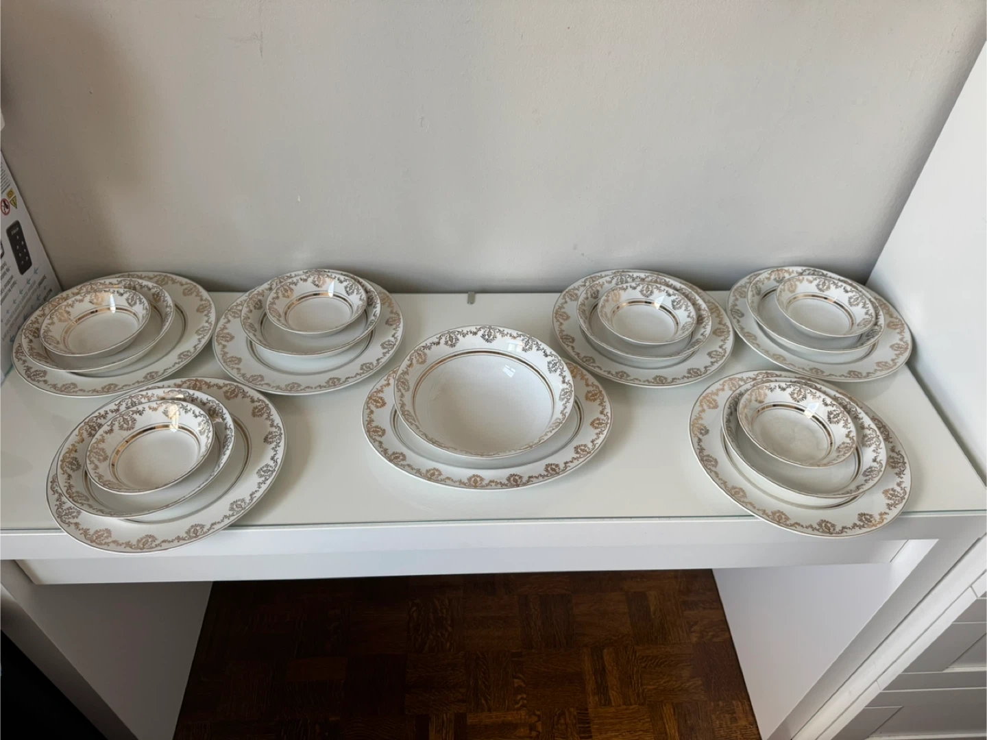 This elegant dinnerware set is a vintage Alfred Meakin "Empire Gold" china set featuring 22k gold trim and accents.