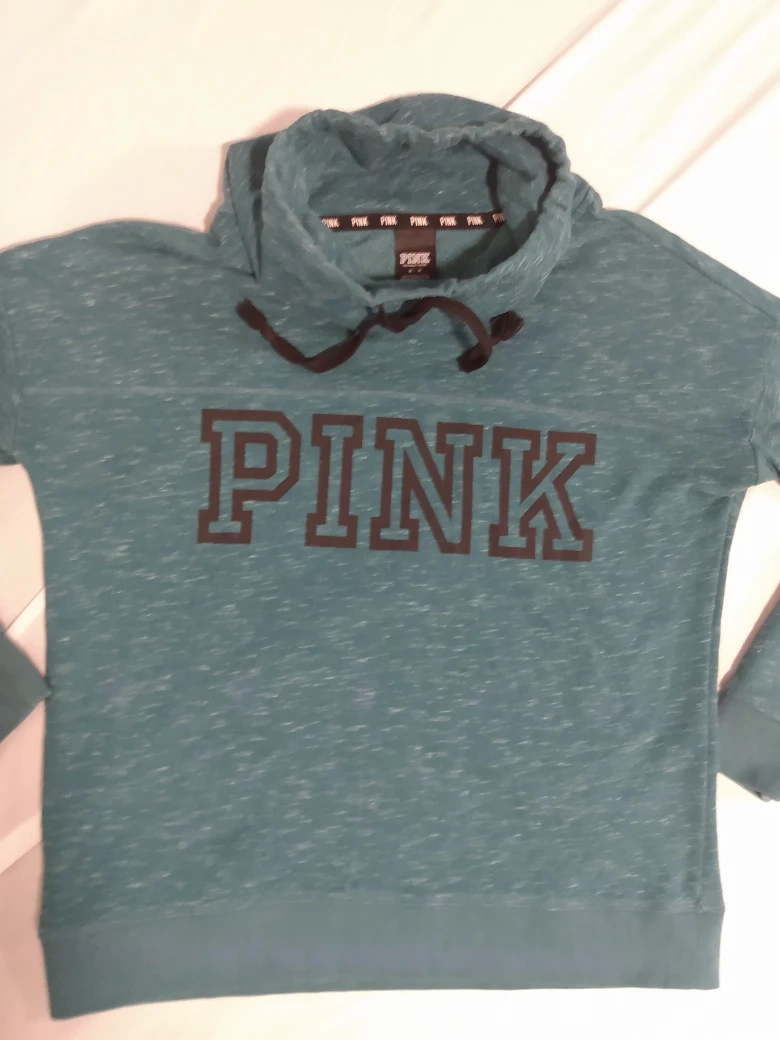 Pink Victoria Secret teal pullover hoodie. Features a mock neck and drawstring. 'PINK' logo on the front and 'LOVE PINK' on the back. Long sleeves and ribbed cuffs.100% Cotton Machine washable Non smoking home and pet free. I can deliver to any Skytrain Station you choose or if your not near one no problem. OBO