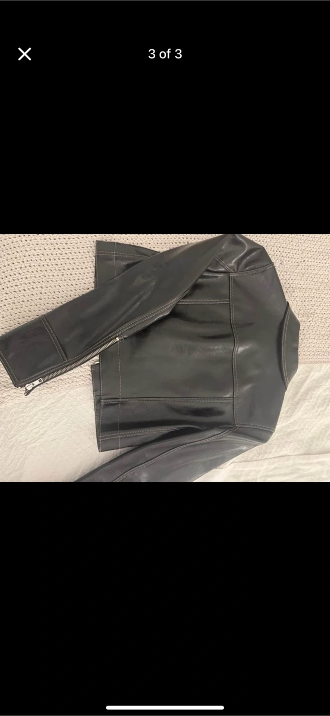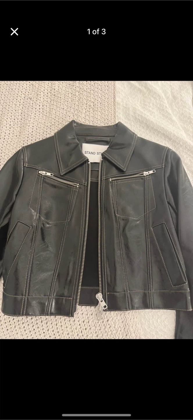 Selling a STAND STUDIO black leather jacket in size 32. It's in great condition and perfect for adding a stylish touch to any outfit. The jacket features a classic design with zipper details.