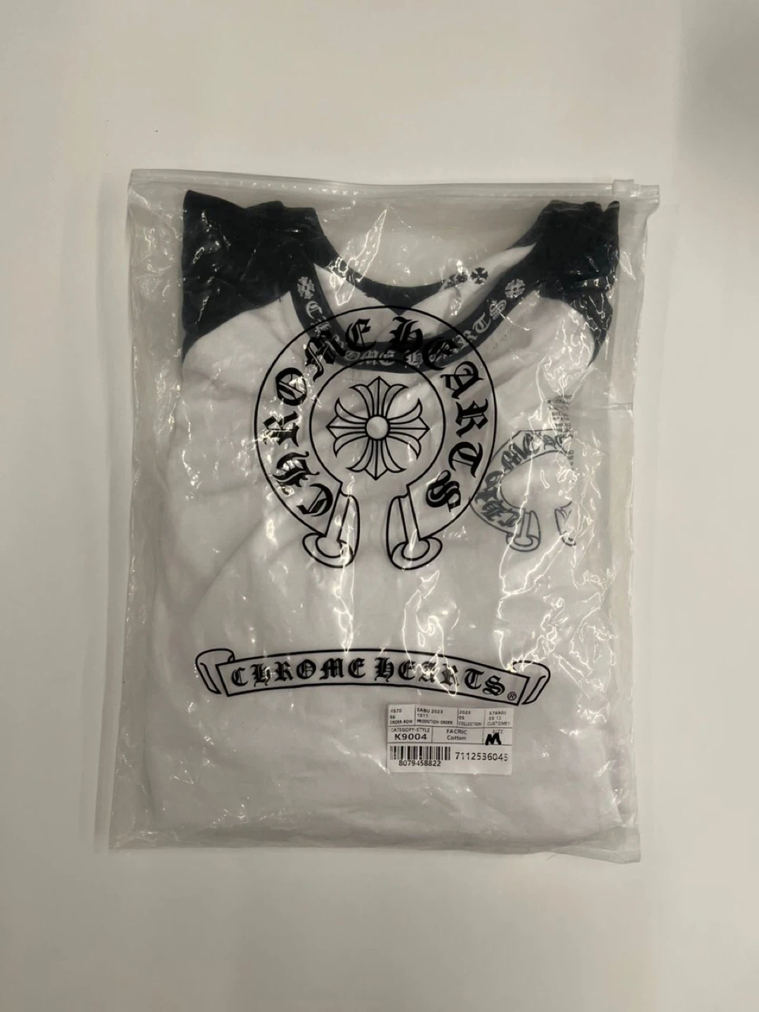 This is a Chrome Hearts long sleeve baseball t-shirt. It features the iconic Chrome Hearts logo on the front and back, with lettering down the sleeves. Made in USA. It's a classic raglan style tee.