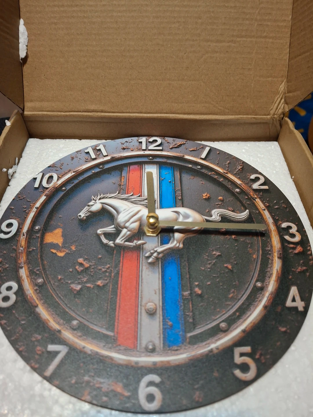 This wall clock features the iconic Ford Mustang horse emblem. It's a great addition for any car enthusiast's garage or den! The clock has a rustic, distressed look.