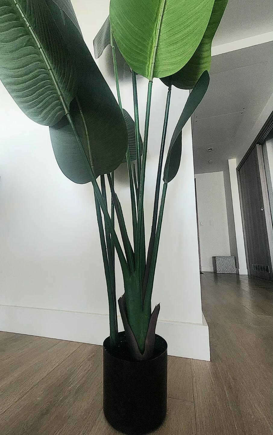 Bring a touch of the tropics indoors with this large faux Bird of Paradise plant. It's housed in a simple black pot. Adds a natural, vibrant look to any room without any upkeep!