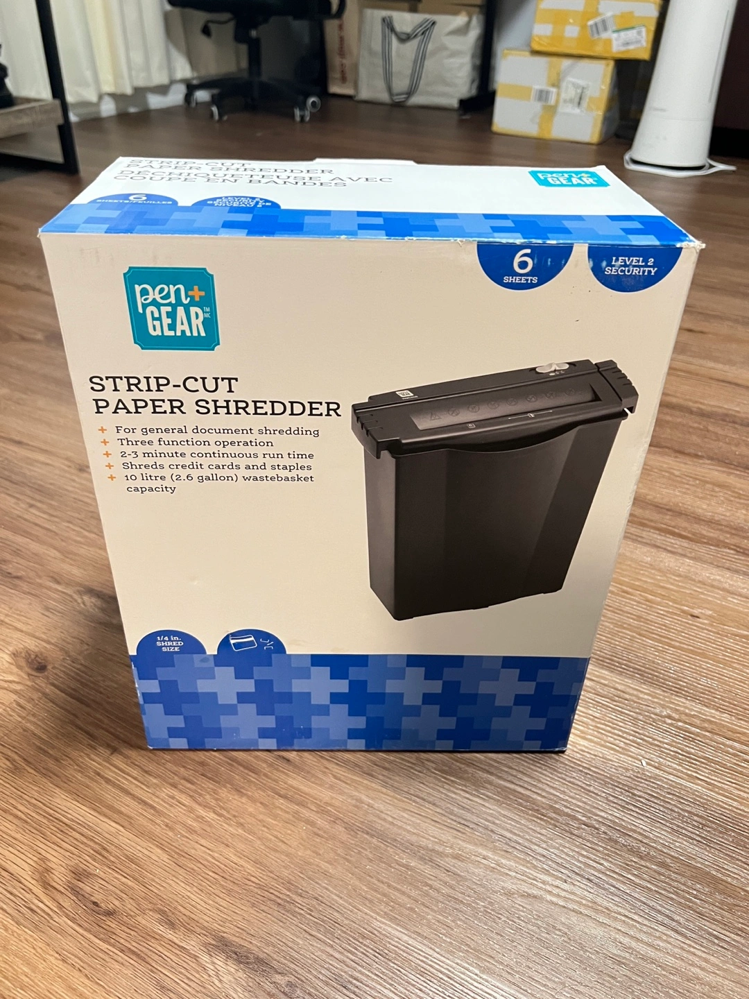 Selling a brand new Pen+Gear strip-cut paper shredder, still in its original box! This shredder is perfect for general document shredding and features a three-function operation. It has a 2-3 minute continuous run time and can shred credit cards and staples. The wastebasket capacity is 10 litres (2.6 gallon). Great for home or office use!