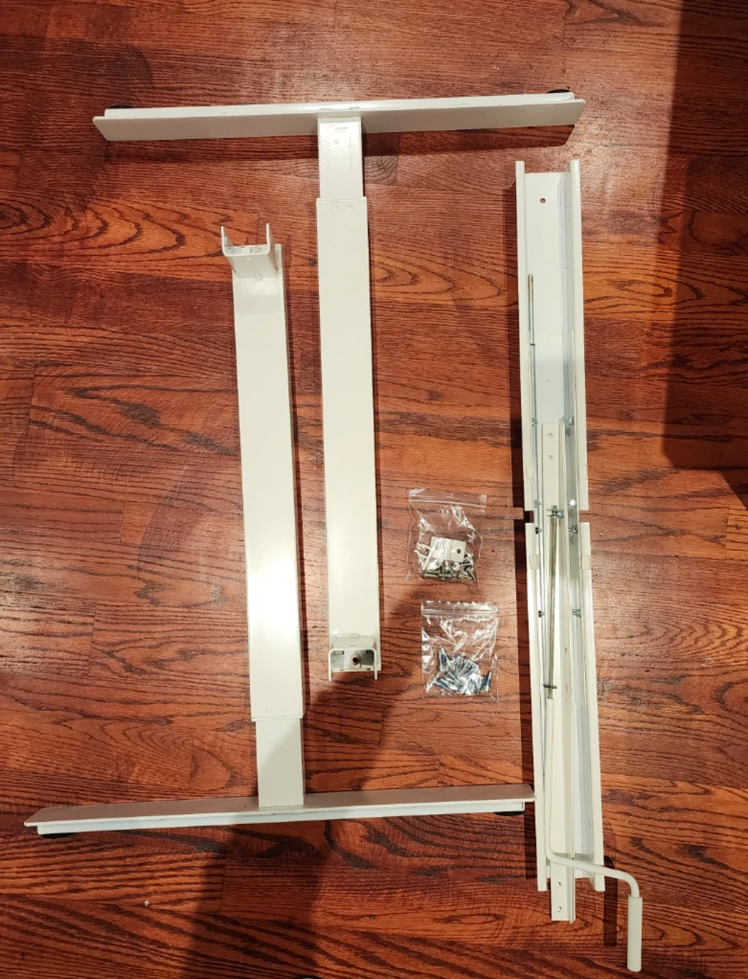 White IKEA TROTTEN sit/stand underframe for tabletops. It's adjustable for tabletops measuring 120/160 cm. Includes all necessary screws for assembly.
