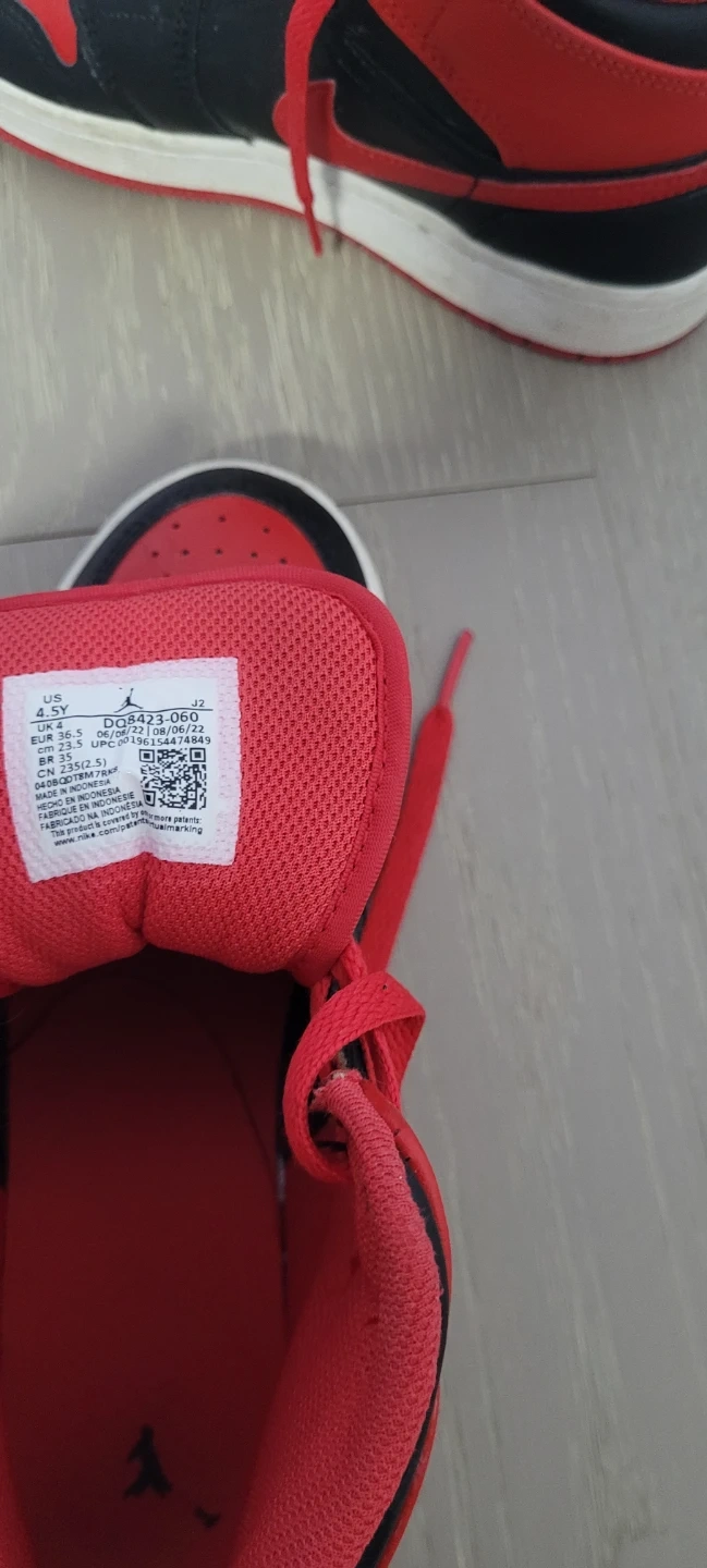 These Jordan 1 Mid SE sneakers are a youth size 4Y. They come in a classic red and black colourway. Built with leather and synthetic materials for durability.