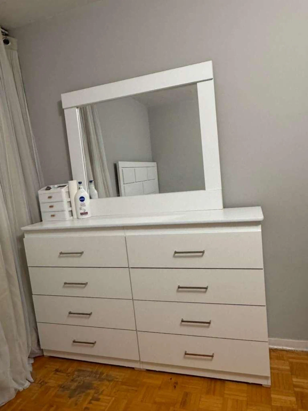 This is a Bedroom set with white dresser with six drawers and an attached mirror. It's made of particle board or MDF. It offers ample storage space for clothing and accessories. This dresser would be useful in a bedroom or dressing area. Used only 4-5 months, receipt available.