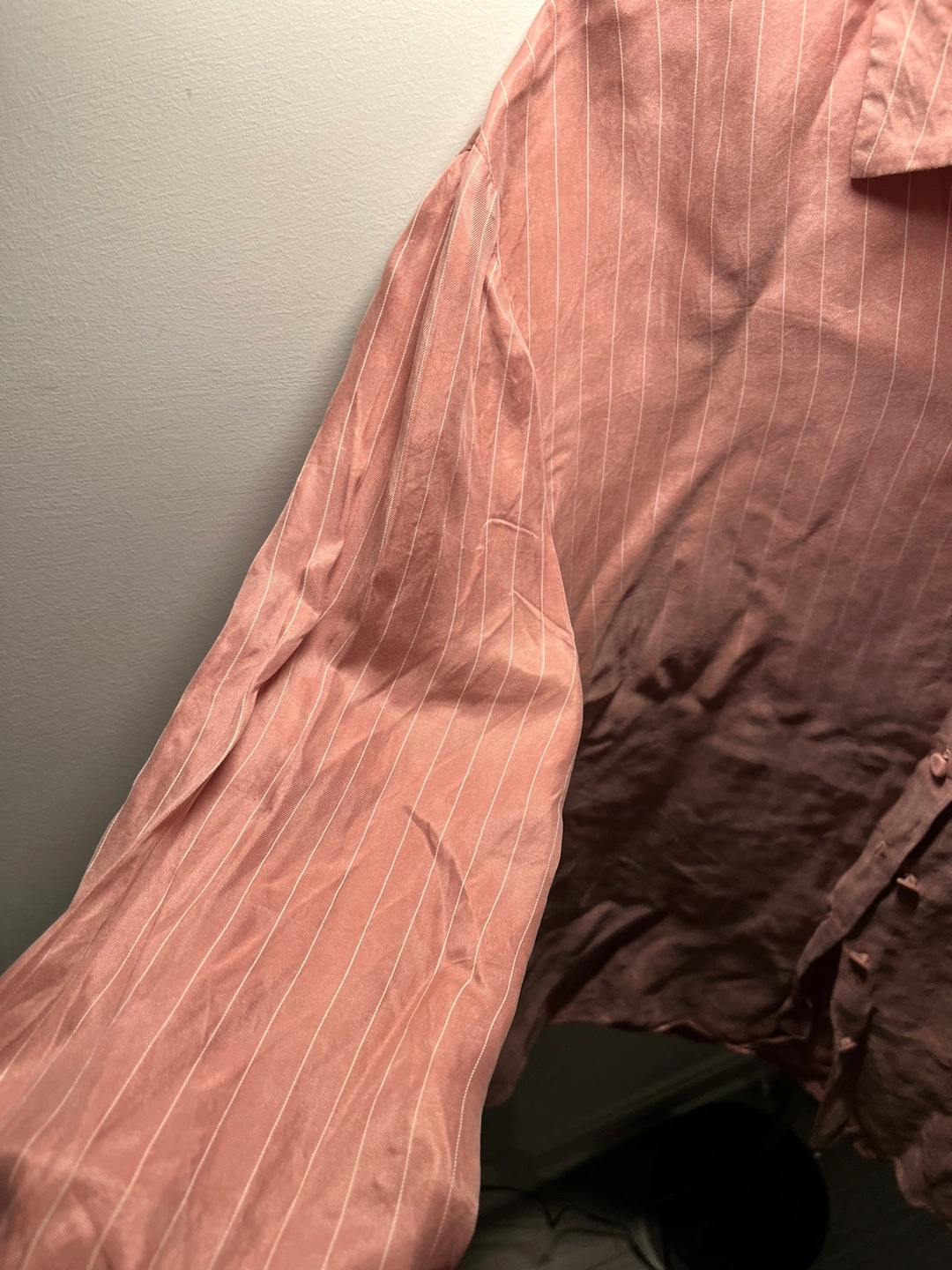 Dusty rose coloured button-down shirt. Features thin white vertical stripes. Long sleeves. Size XS.