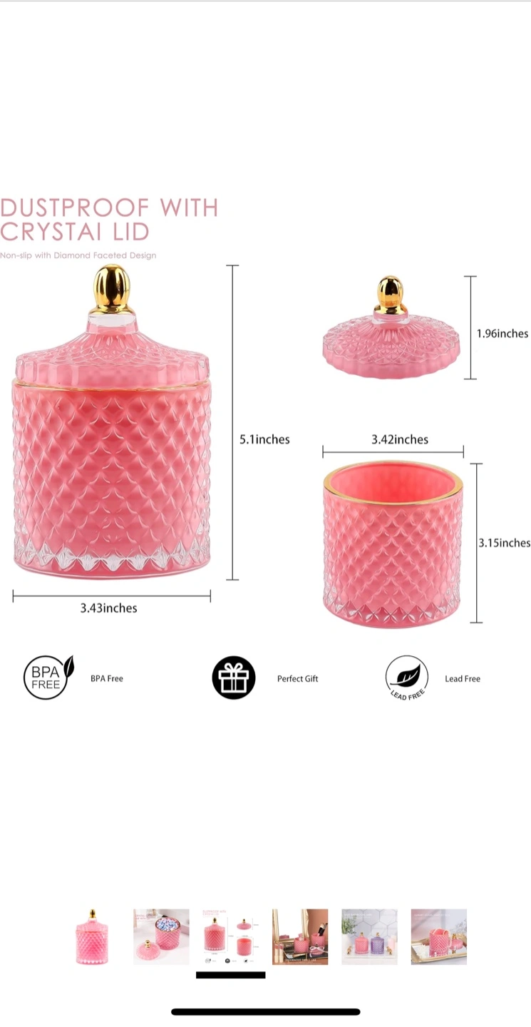 This pink candy jar is made of glass with a diamond faceted design. It features a crystal lid with a gold accent. BPA and lead-free.