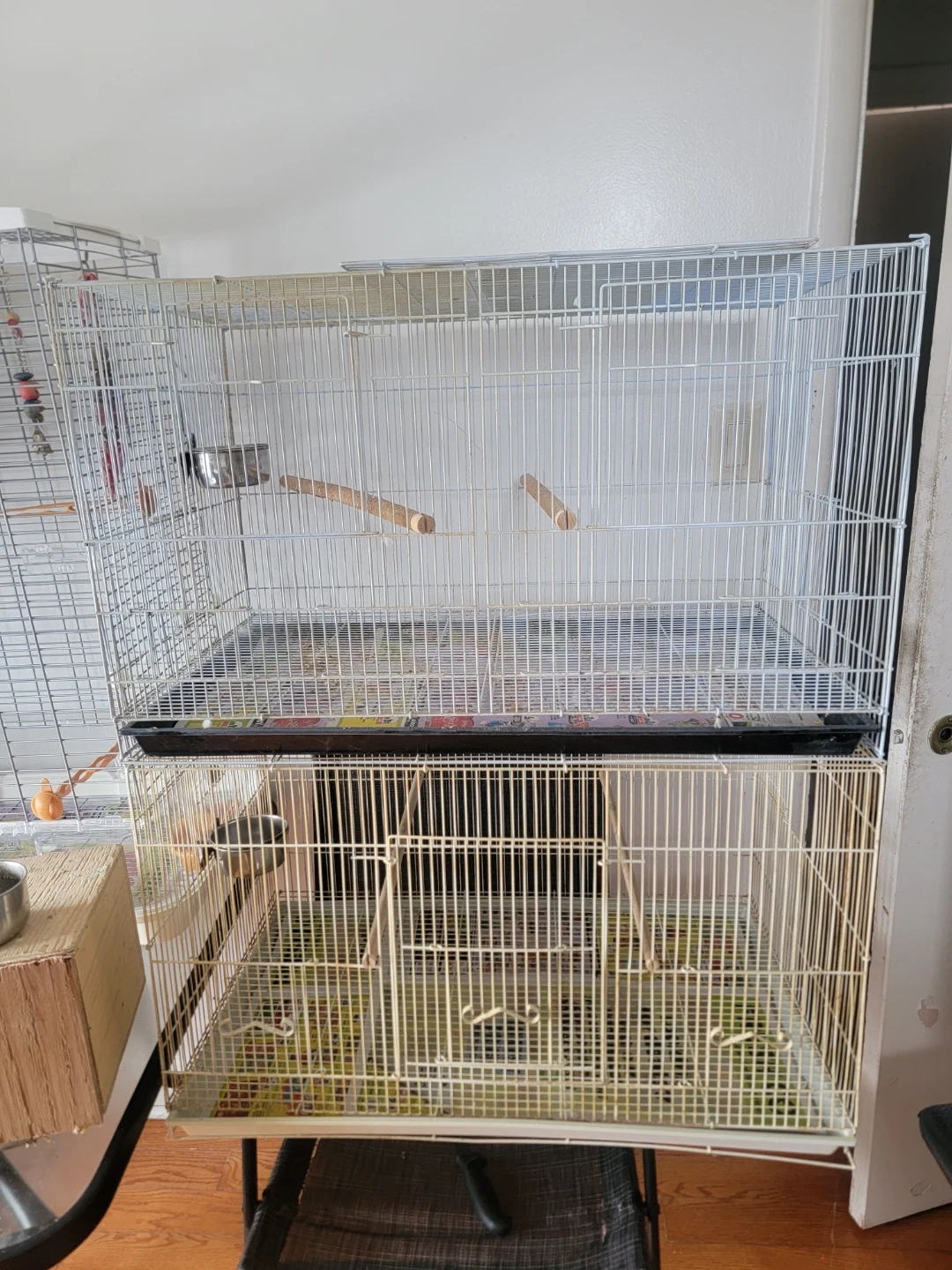 This is a set of two stackable bird cages. Each cage includes two perches and one food/water dish. They're made of metal wire with a plastic bottom tray. Suitable for small birds.
