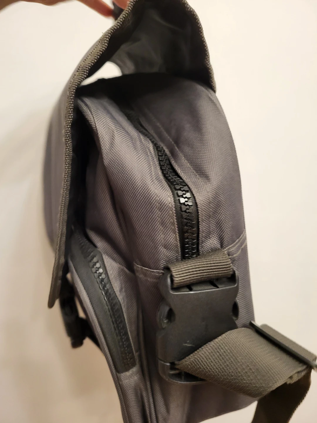 Chivas Regal messenger bag in a charcoal grey colour. It has a flap closure with a buckle and multiple zippered compartments. Durable fabric construction.