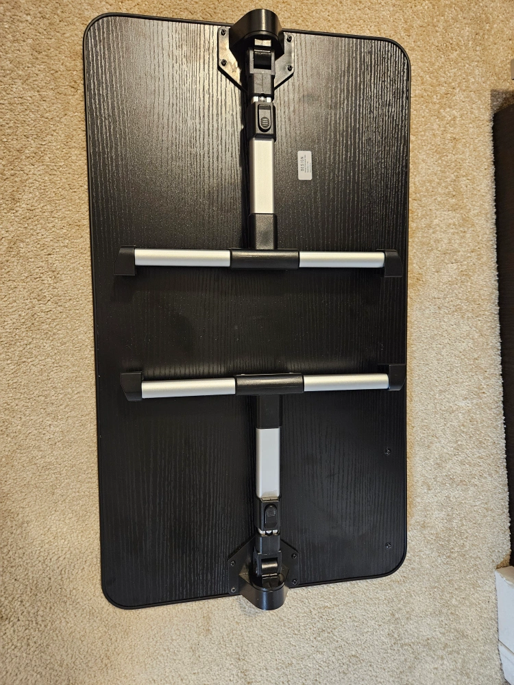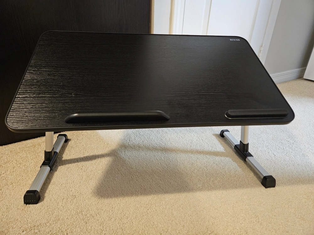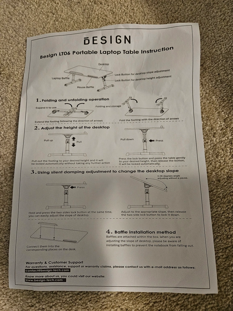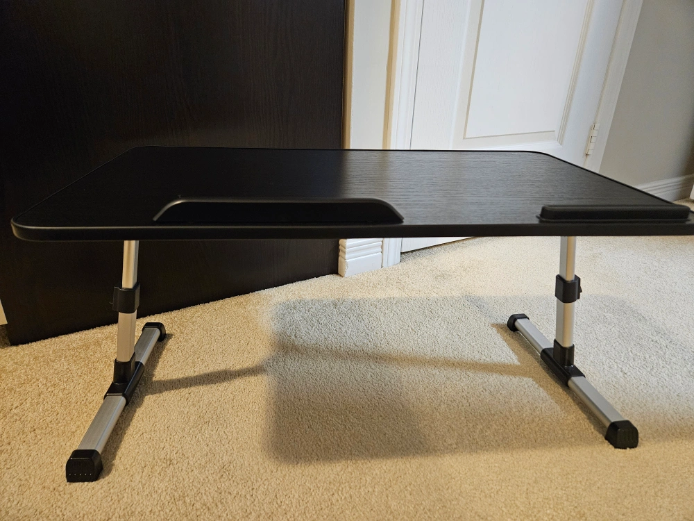 Foldable laptop table. Black surface, silver legs. Adjustable height and angle. Includes instructions.
