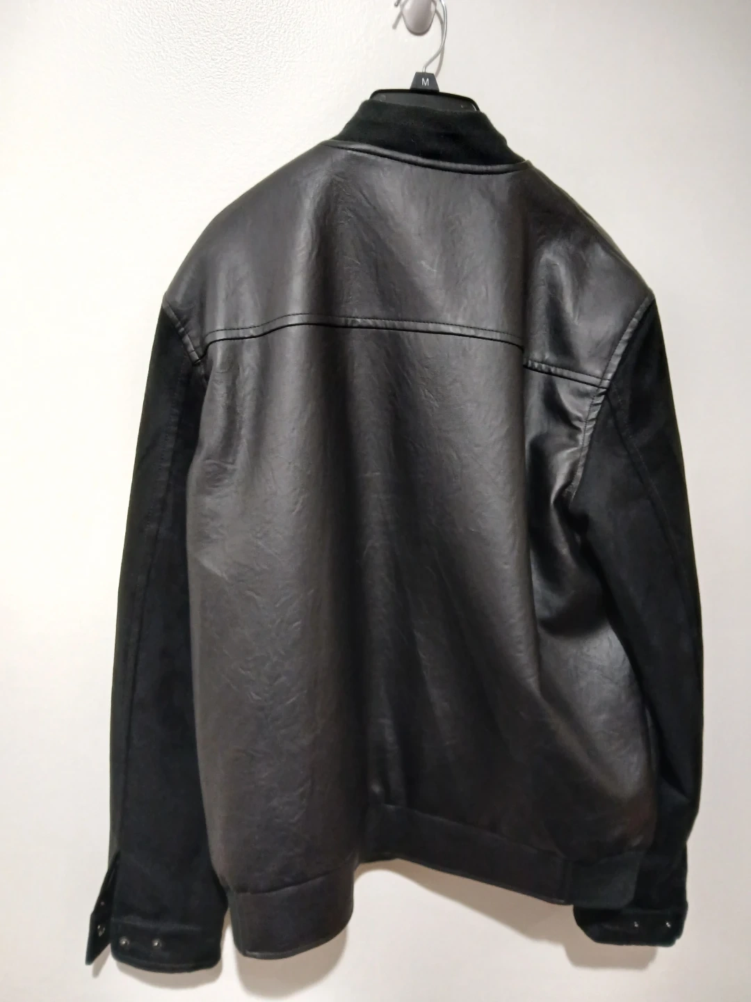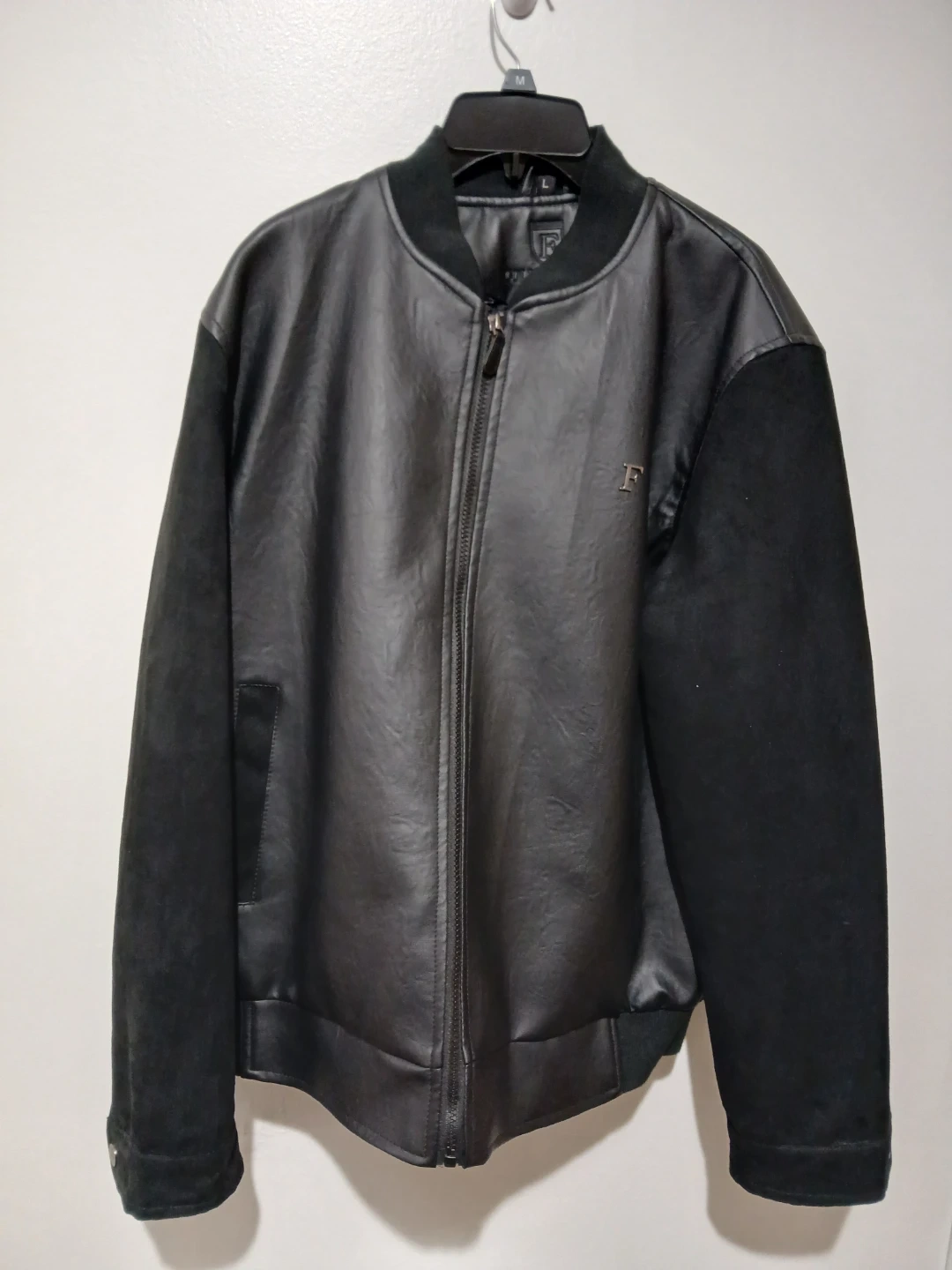 This black bomber jacket features a faux leather front and sleeves with suede side panels. It's lined with a black satin material with a repeating brand logo pattern. Includes a full zip closure and ribbed collar, cuffs, and hem.