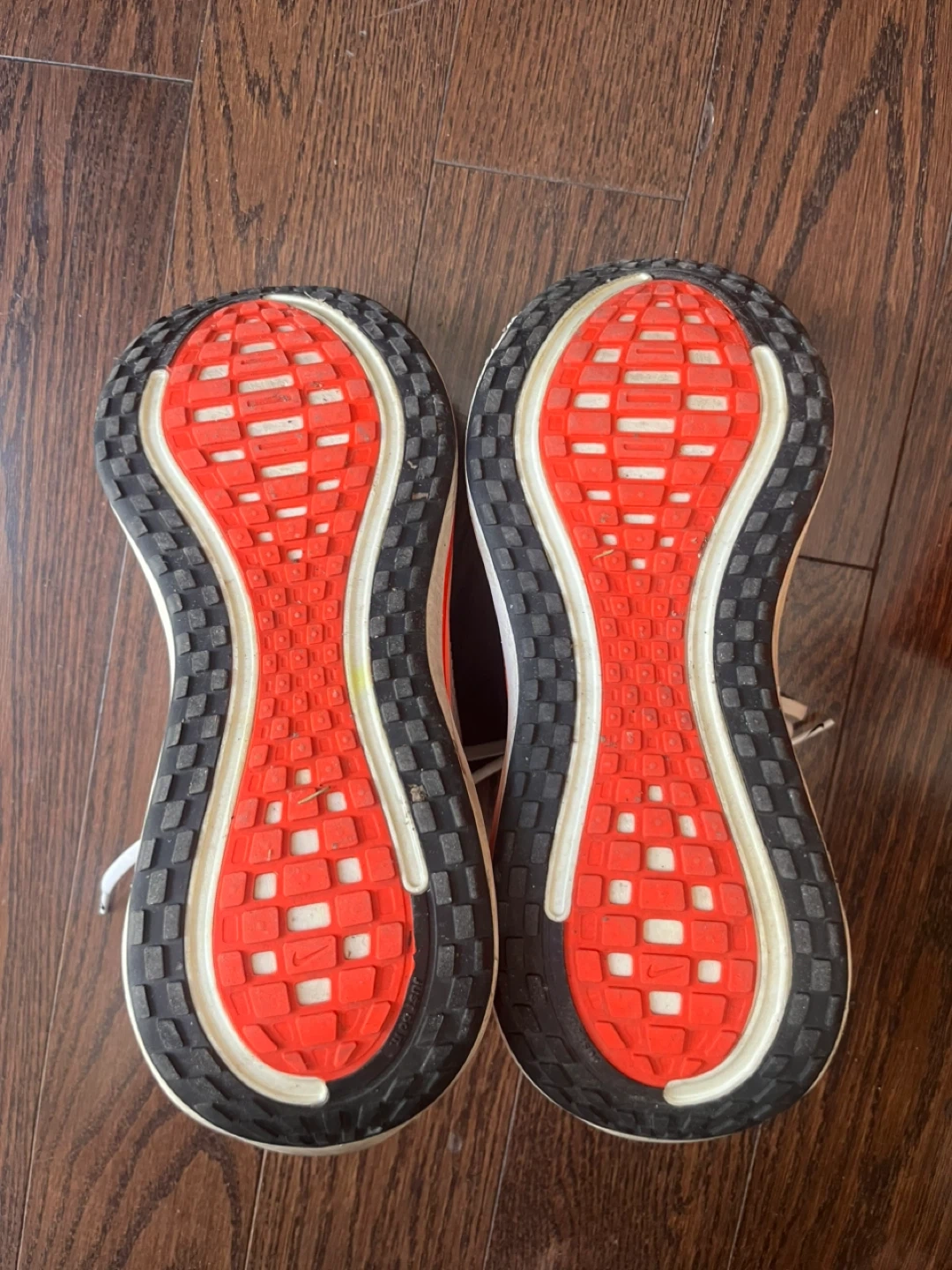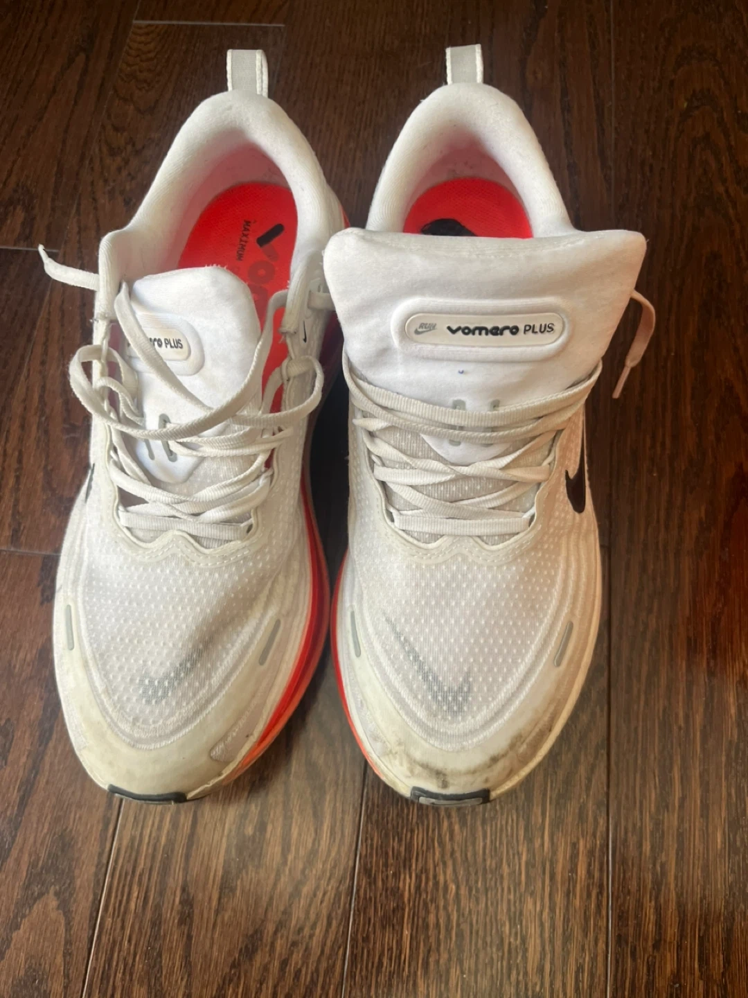 White Nike Vomero Plus running shoes. Men's US size 11, women's US size 12.5. Includes original box. Plenty of life left.