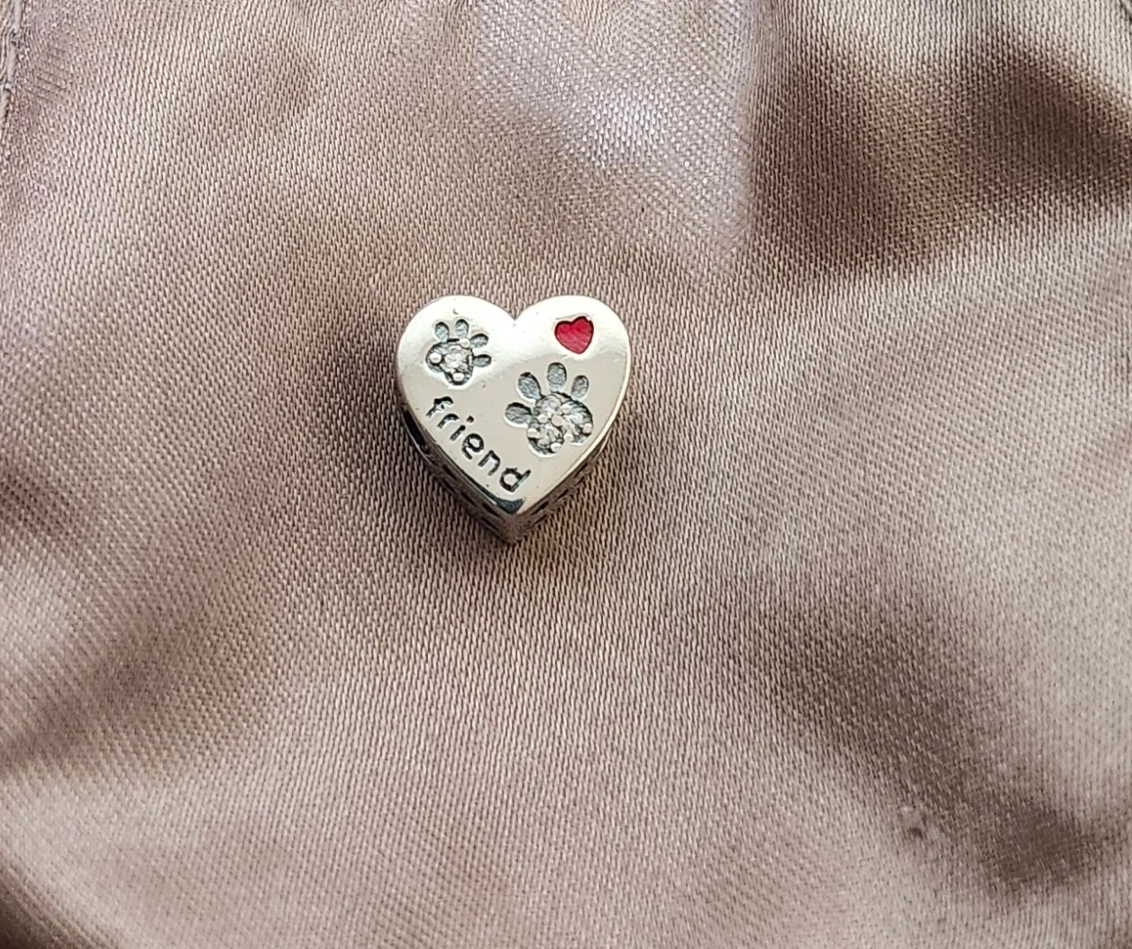 This charming heart-shaped bead features paw prints and the word "friend" engraved on it. It has a small red heart accent. It's perfect for a bracelet or necklace to show your love for a pet.