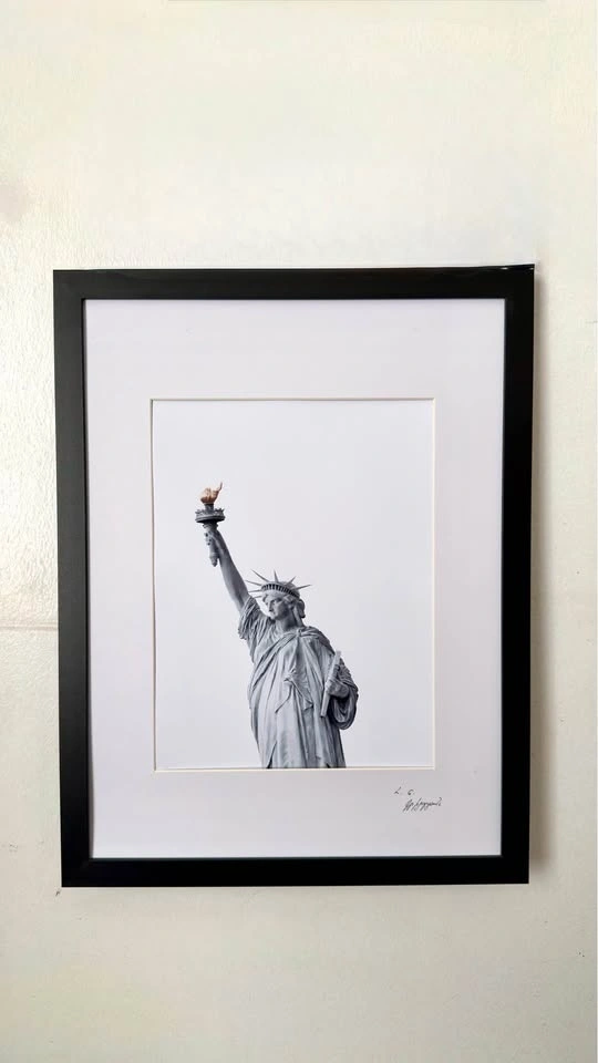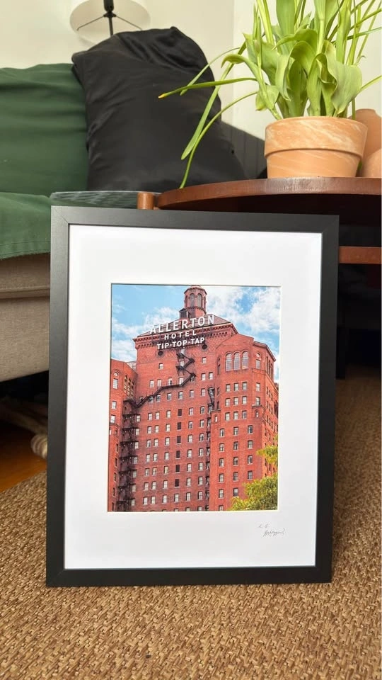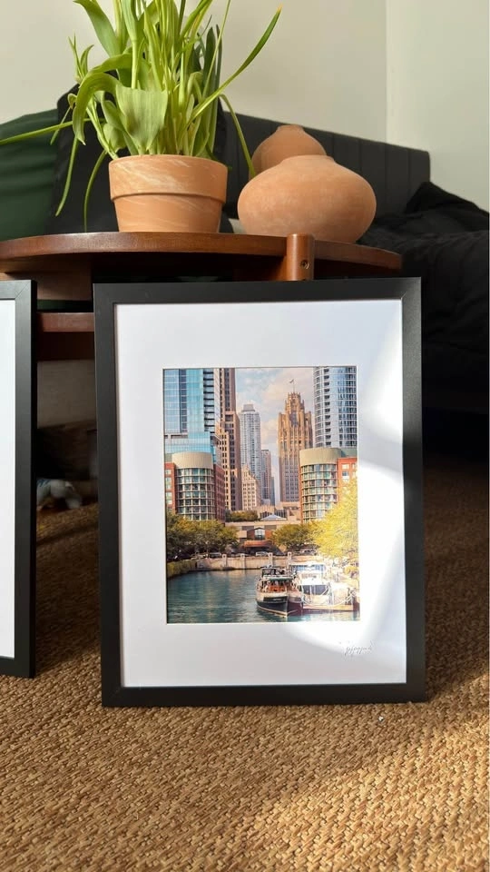 Cool framed art prints featuring a mix of city scenes and famous landmarks. Includes prints of the Statue of Liberty, the Allerton Hotel, and street views from San Francisco, Chicago, and New York. All are in black frames with white mats and signed by me, the photographer.