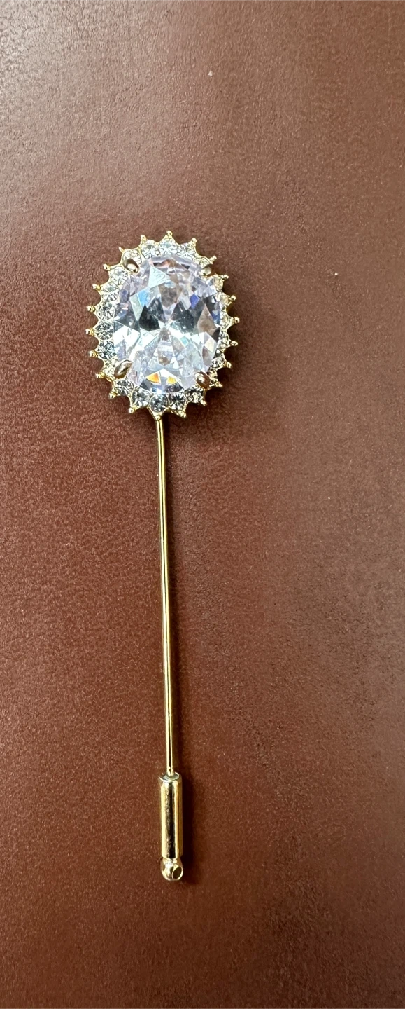 This lapel pin has a gold-tone finish and features a large, oval-shaped crystal surrounded by smaller clear stones. It's designed with a decorative sunburst halo around the main stone. The pin includes a traditional stick pin backing and a small cap for securing it. It adds a touch of sparkle to any outfit!
