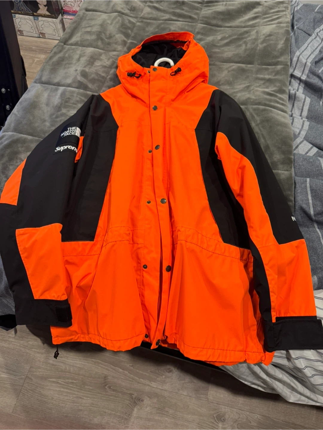 This is a The North Face jacket with Supreme branding. It's orange and black with a hood.