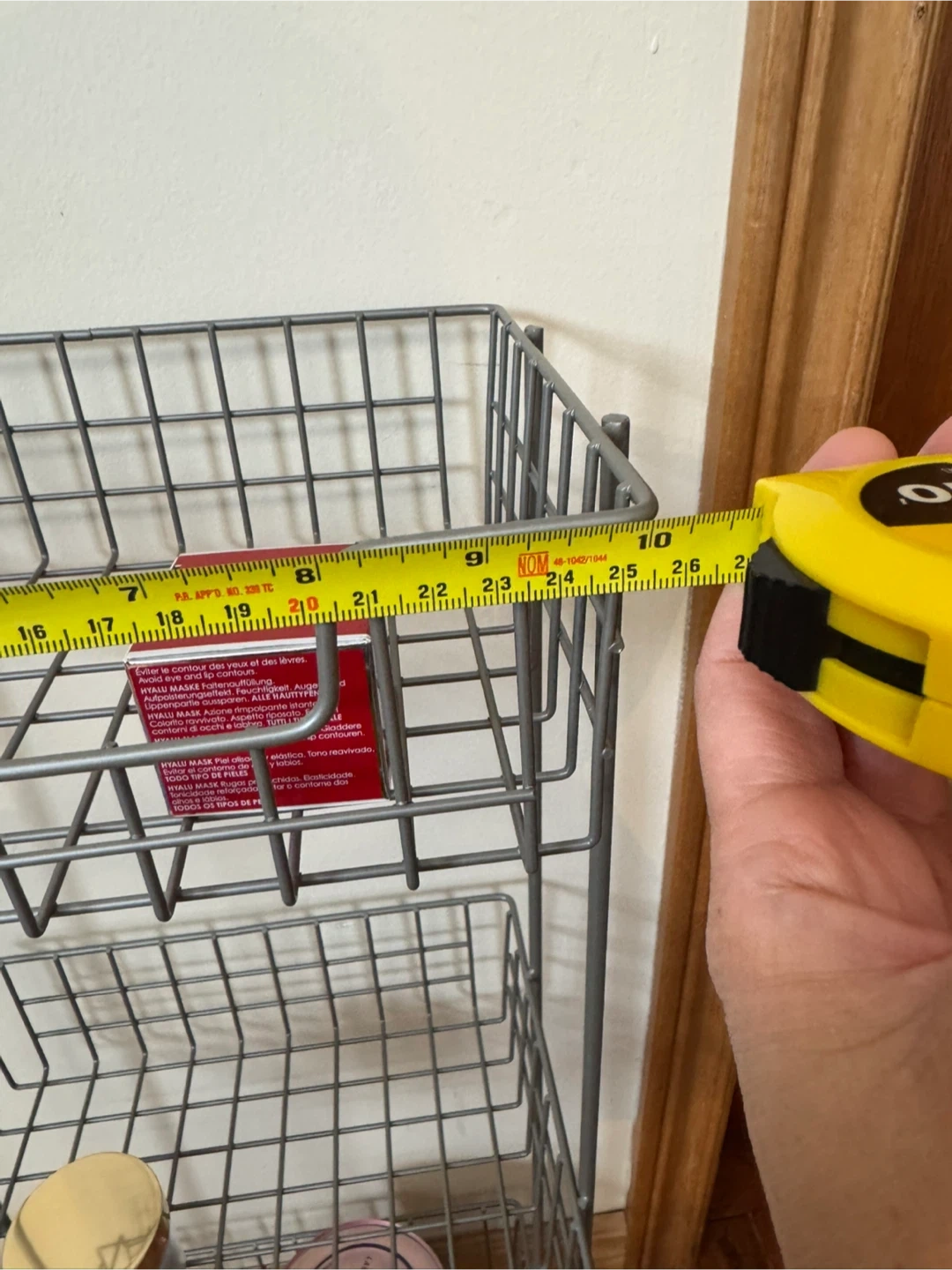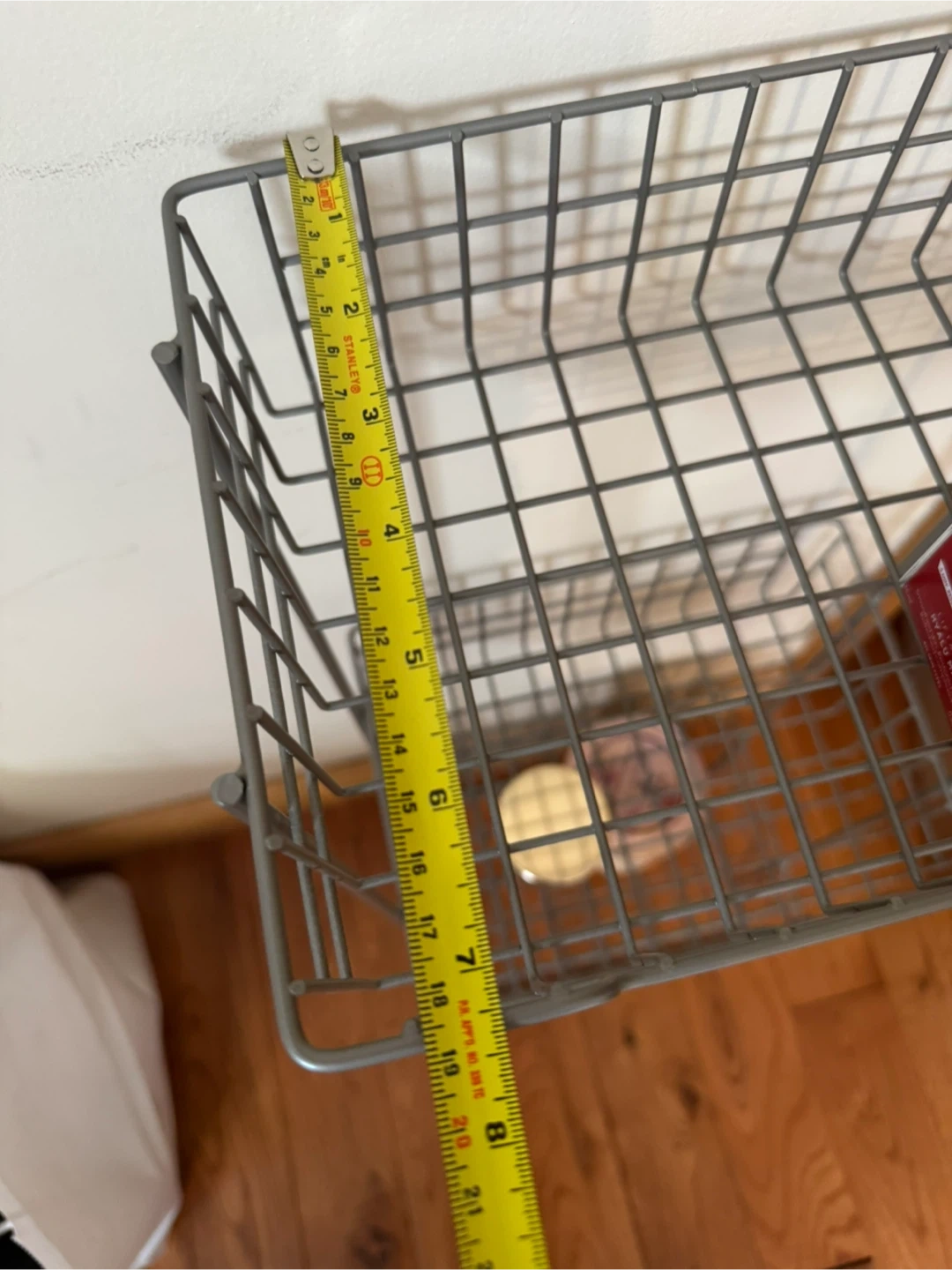 This grey metal wire shelving unit has three baskets for storage. It's great for organizing toiletries, pantry items, or craft supplies. The unit measures approximately 29 inches tall.