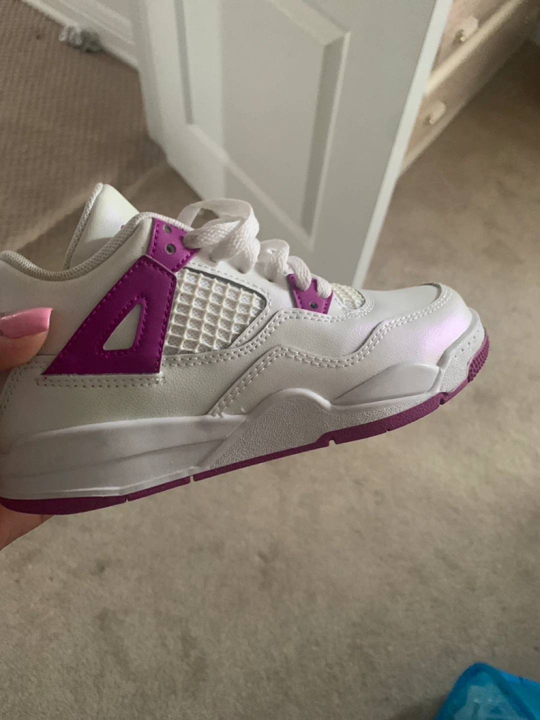 These adorable Air Jordan 4 Retro toddler shoes are in great condition! The white and purple colourway is super cute. Perfect for your little one's first steps in style