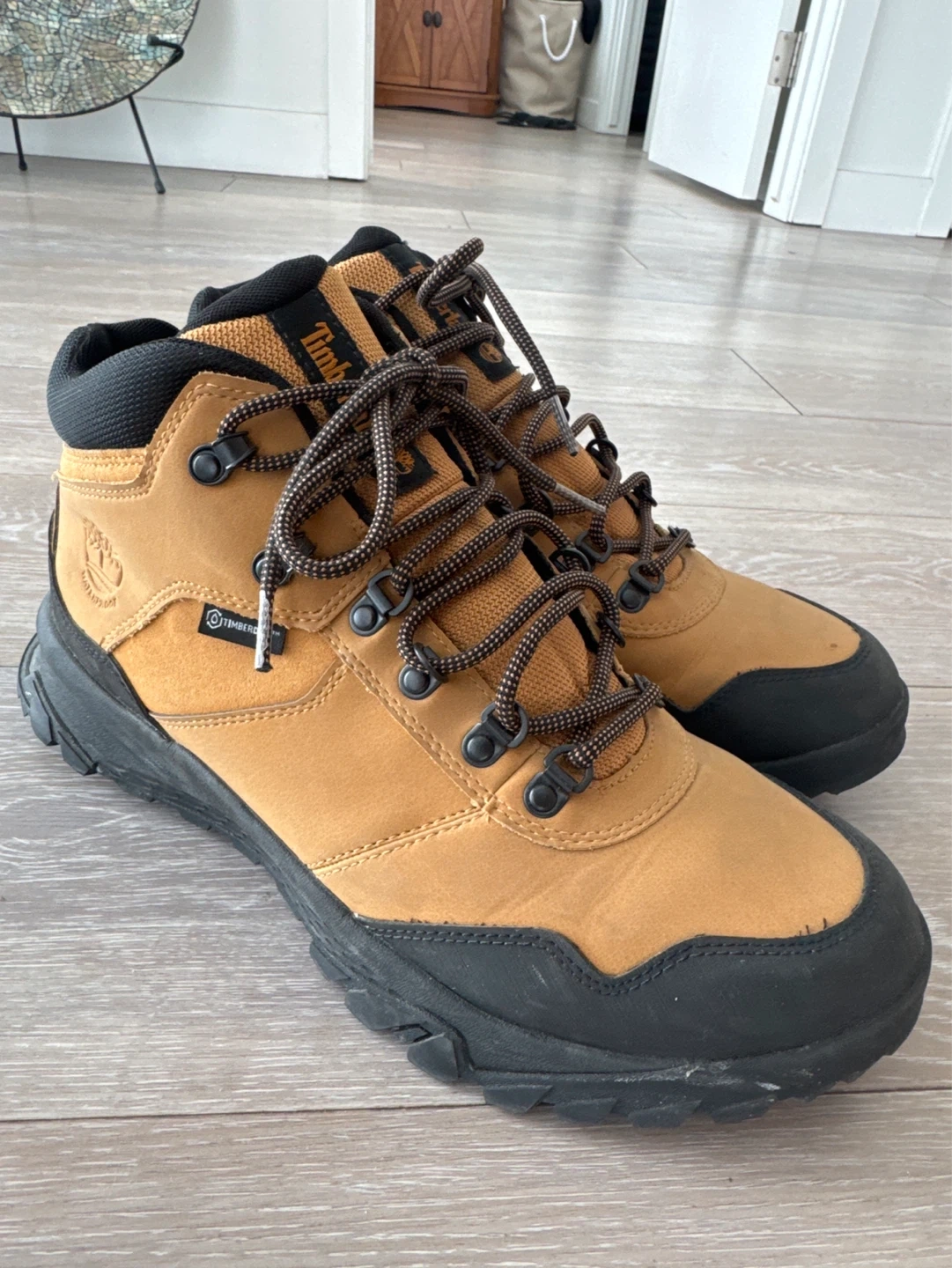 Timberland men's hiking boots in a tan colour. These boots are size 10 US. Made in Cambodia. New