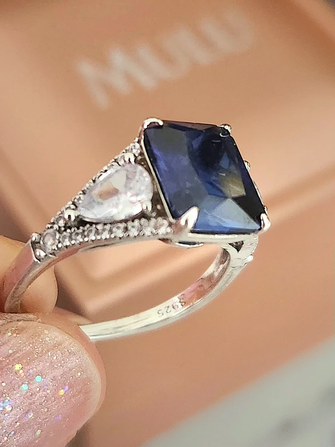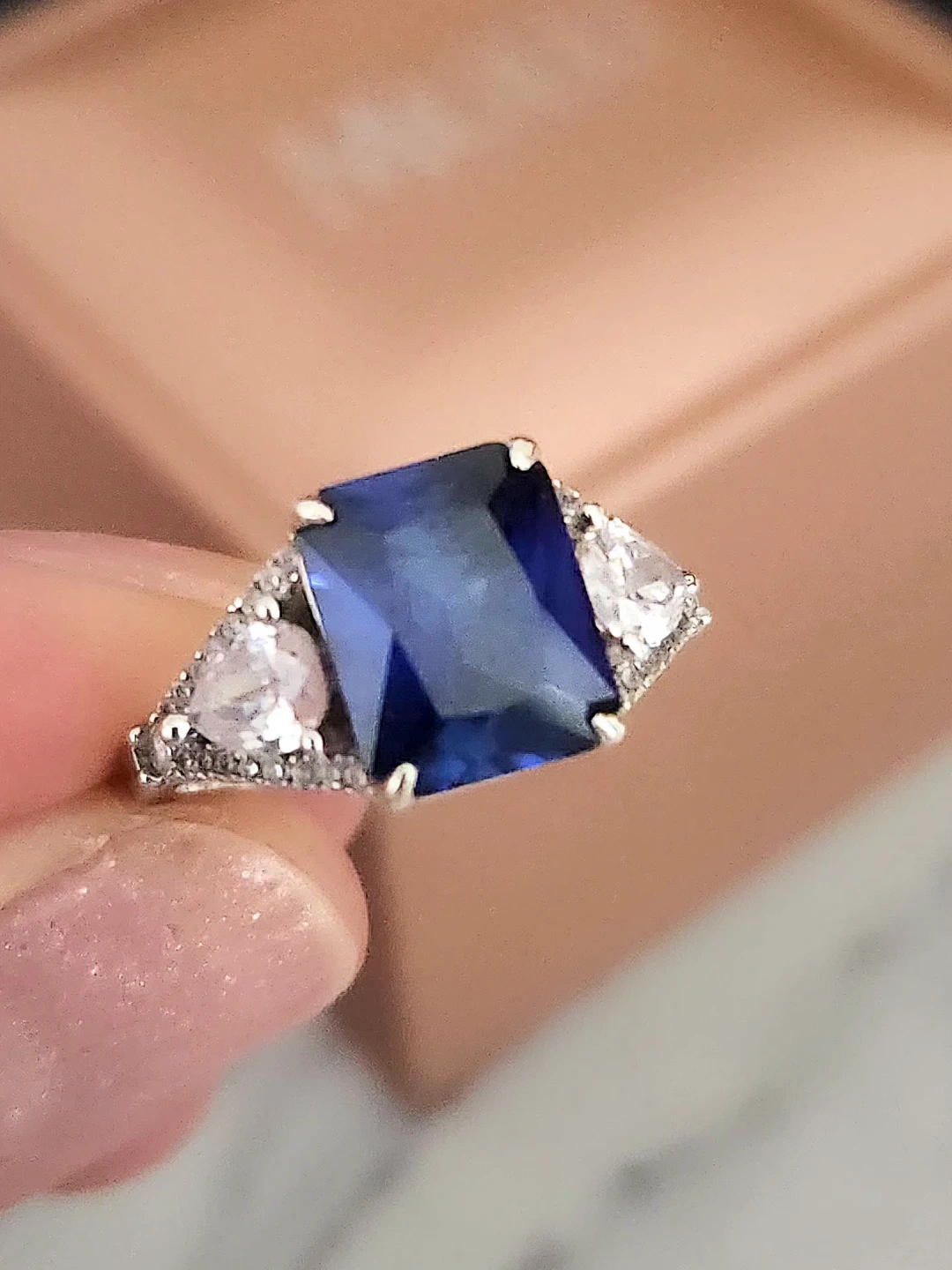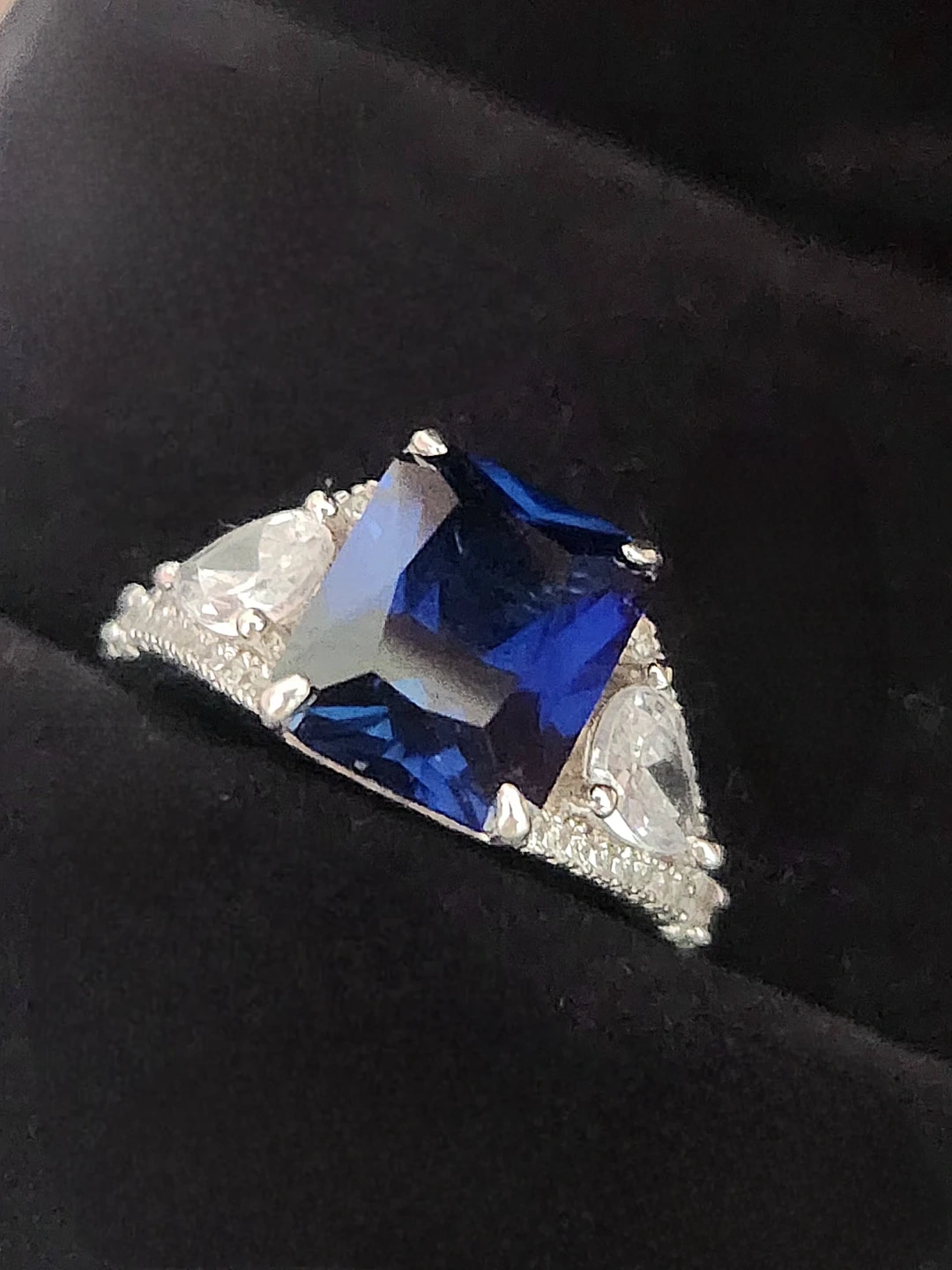 This elegant ring features a stunning emerald-cut blue gemstone sapphire centre, accented by pear-shaped stones and small diamond details along the band. Crafted with quality materials for a beautiful shine. A lovely statement piece! Purchased for around $300 and worn only twice, so it's in like-new condition, perfect for gifting. Comes with original gift bag and a lighted ring box. Asking $200obo.