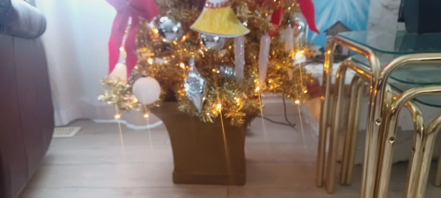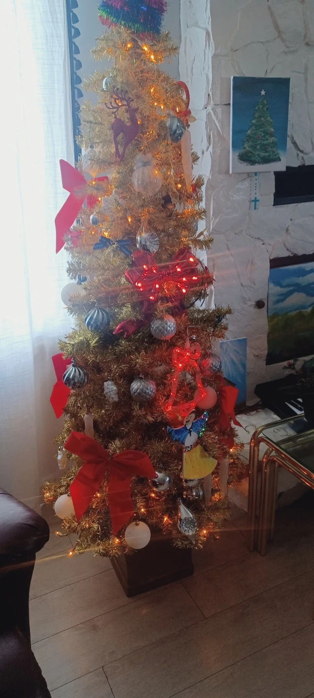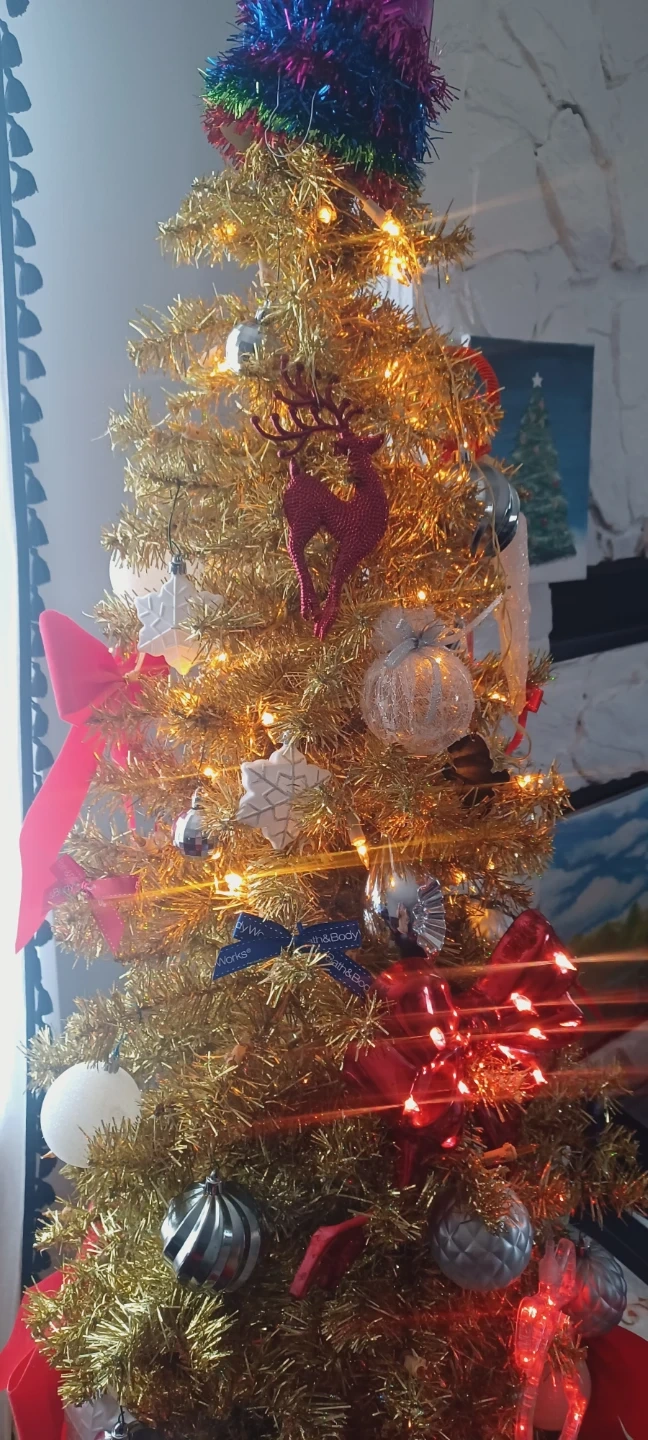 Selling a pre-decorated gold Christmas tree! It comes with a variety of ornaments and red bows , all lights included.