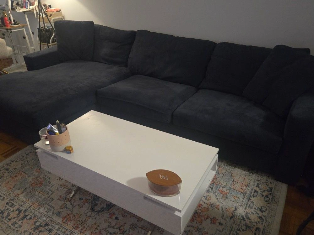 Gently used Room & Board Metro sectional with a timeless, modern design. It offers deep seating and luxurious comfort. The classic navy-blue microfiber suede is stylish and pet/kid-friendly, perfect for NYC living rooms. This sectional provides generous seating without taking up too much space. Known for its comfort and craftsmanship, this Room & Board Metro piece originally retailed for $2,699. Pick up only in Wall Street, NYC. Pillows included!