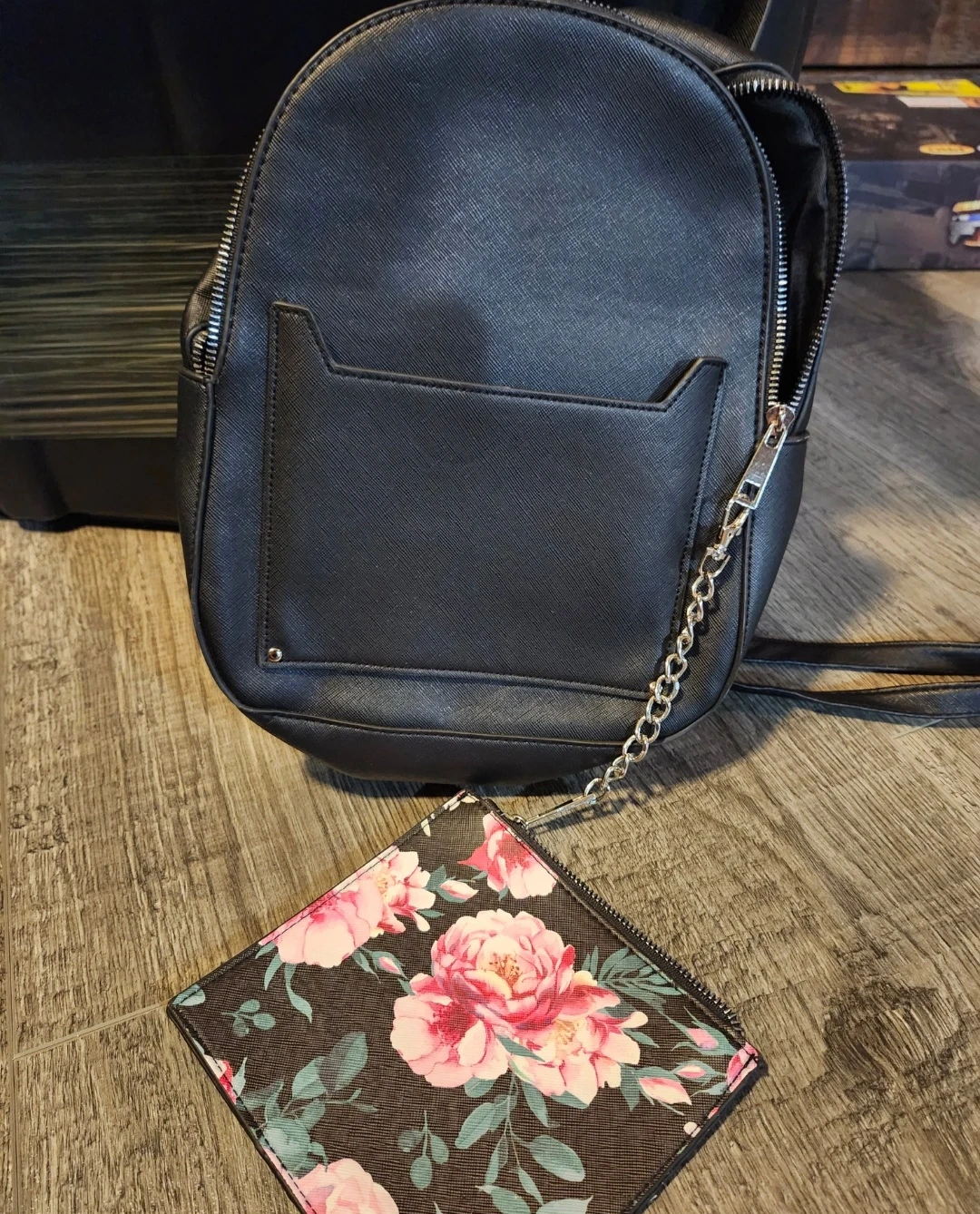 This black faux leather mini backpack comes with a matching floral print pouch. It's got a front pocket with a chain detail. It's a stylish option for carrying your essentials!