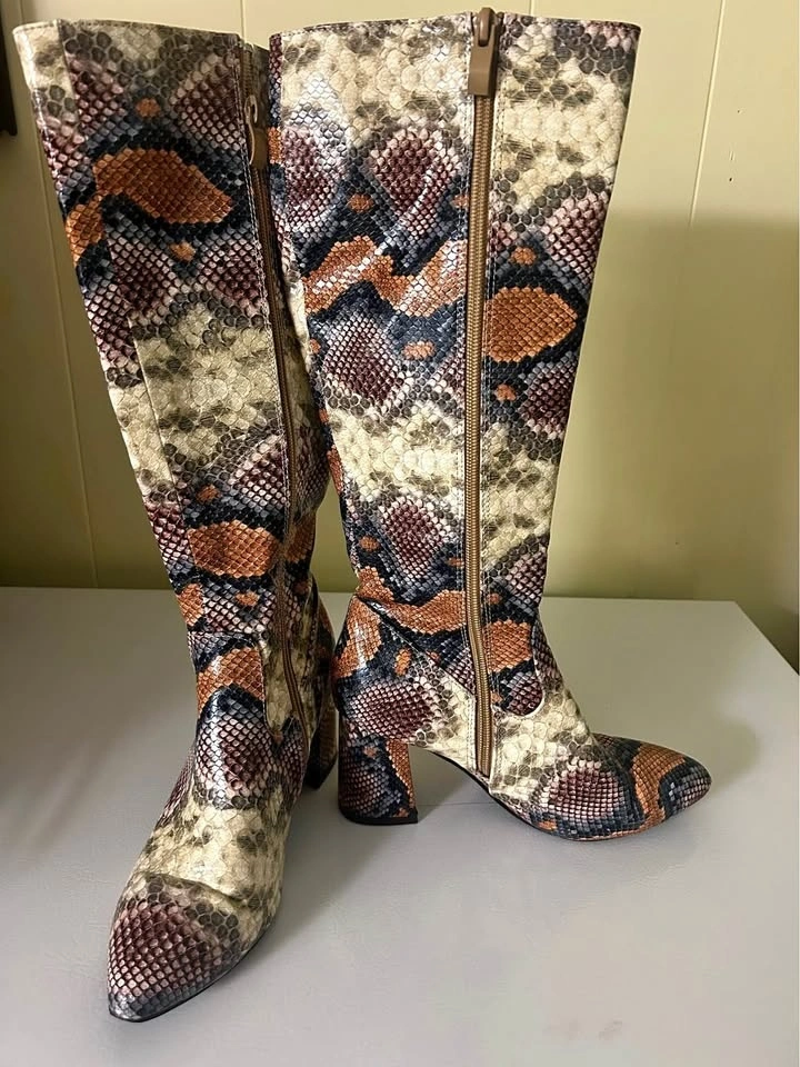 Stylish faux snakeskin tall boots with a cool multicolored print in browns, blacks, and creams. Knee-high style with block heels and a zipper closure. Size 36.