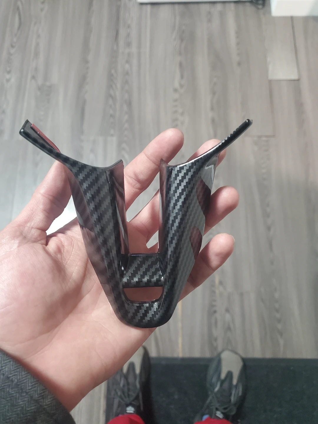 This is a steering wheel trim piece with a carbon fiber look. It's designed to add a sporty aesthetic to your car's interior. It has an adhesive backing for easy installation. Fits veloster n