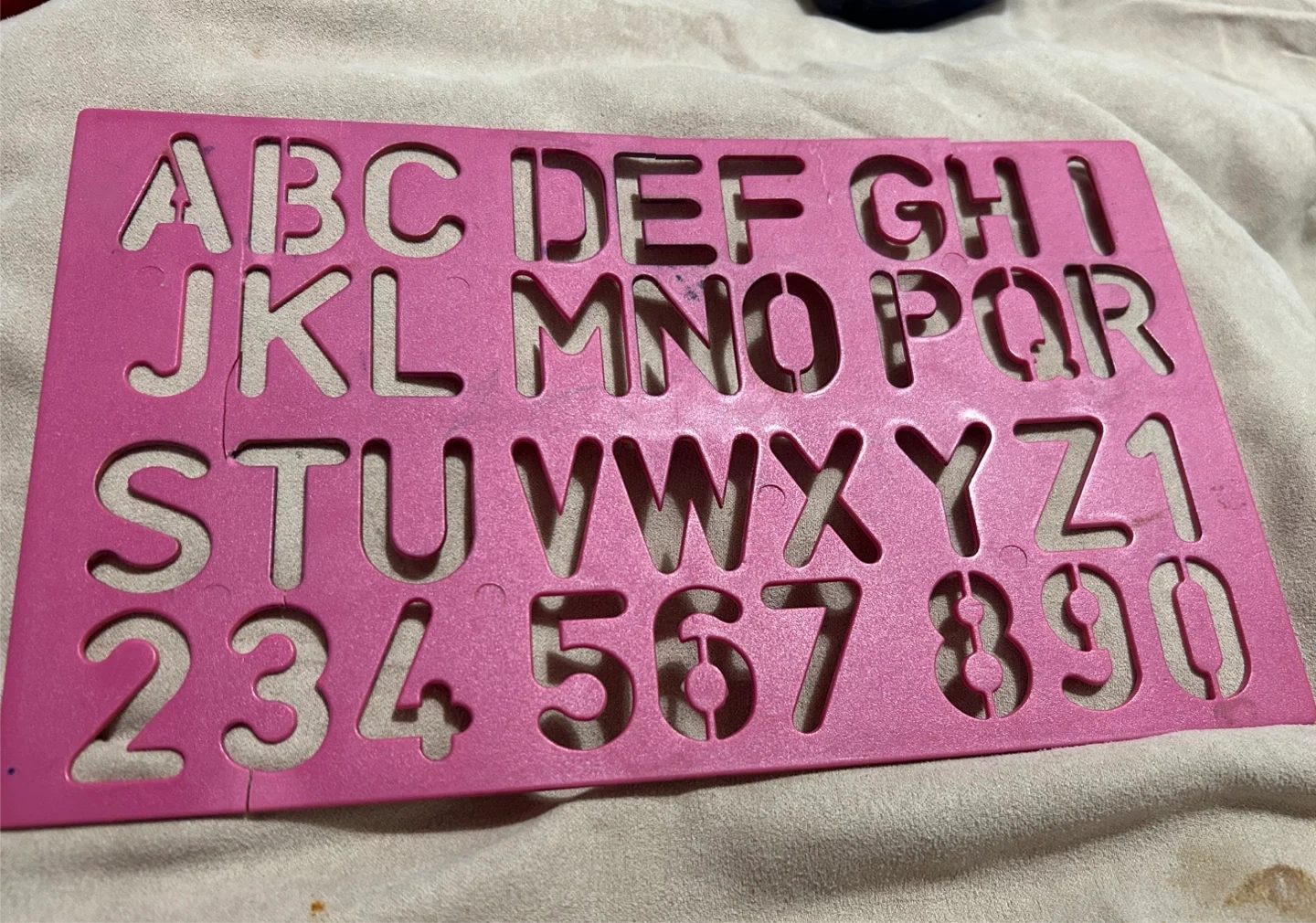 This is a pink plastic stencil sheet featuring all uppercase letters from A to Z, plus numbers 0 to 9. It's a useful tool for crafting and educational projects. The stencil is made of durable plastic.