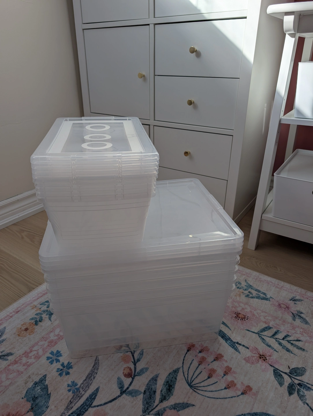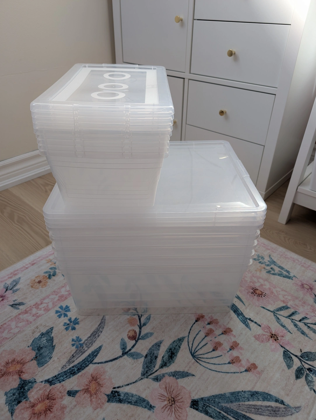 Selling a set of clear plastic storage boxes with lids. Great for organizing your home!